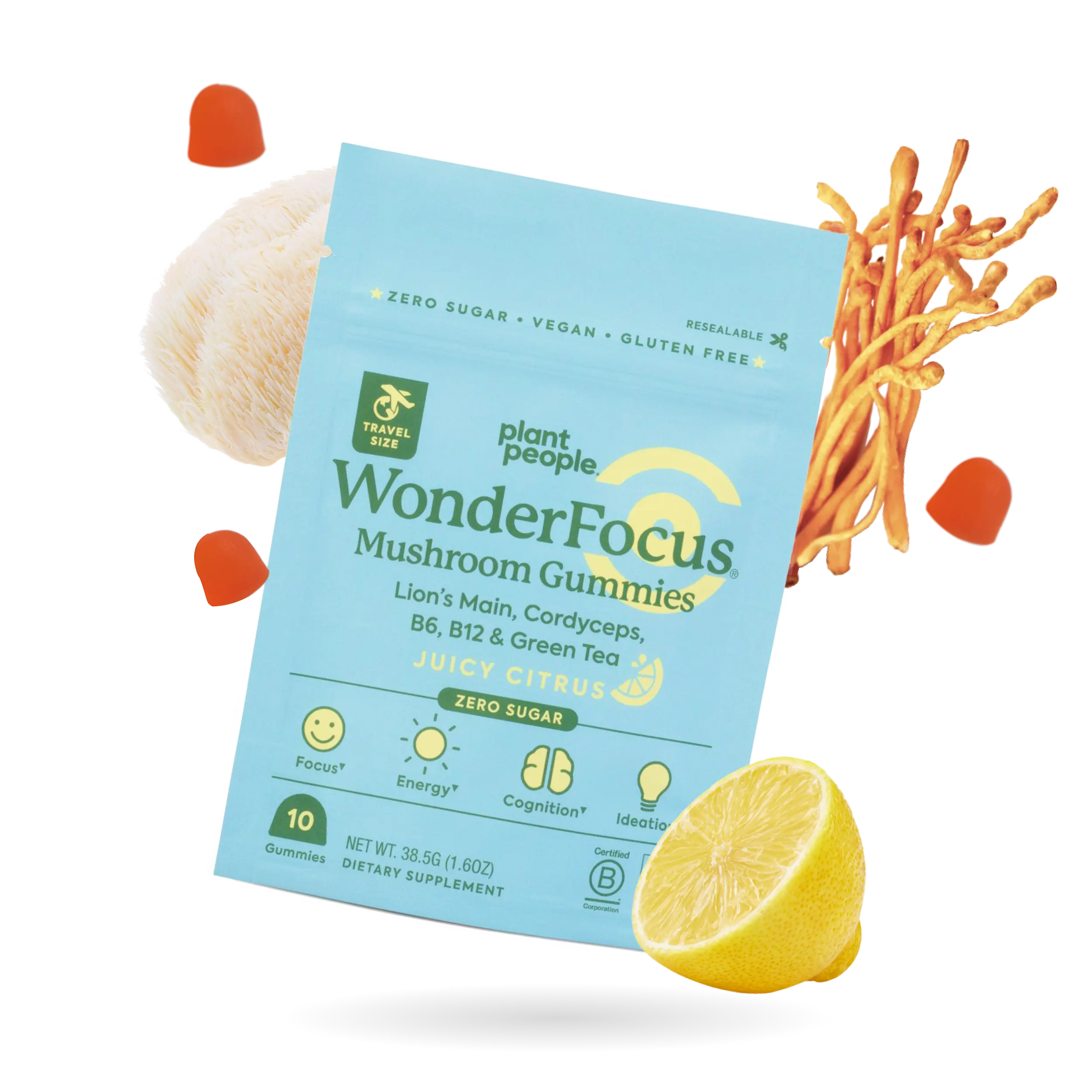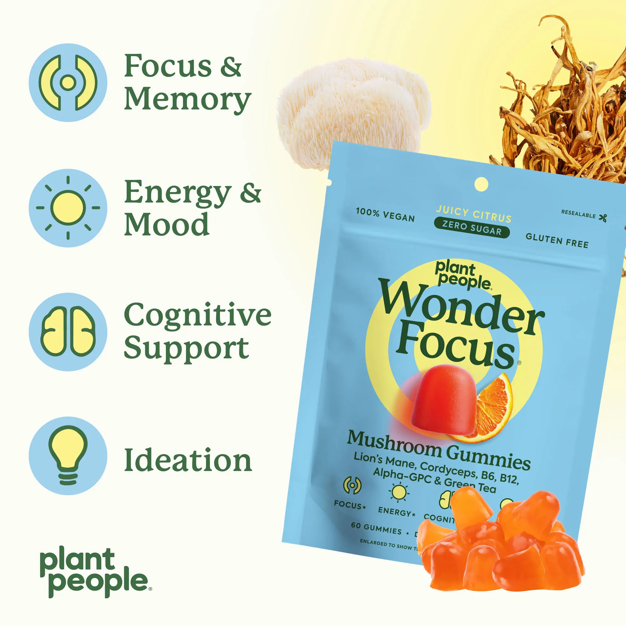 Made with Lion's Mane, Cordyceps, B6, B12, Green Tea (75mg of caffeine) & Alpha-GPC. 60 gummies per pouch. 30-day supply.
