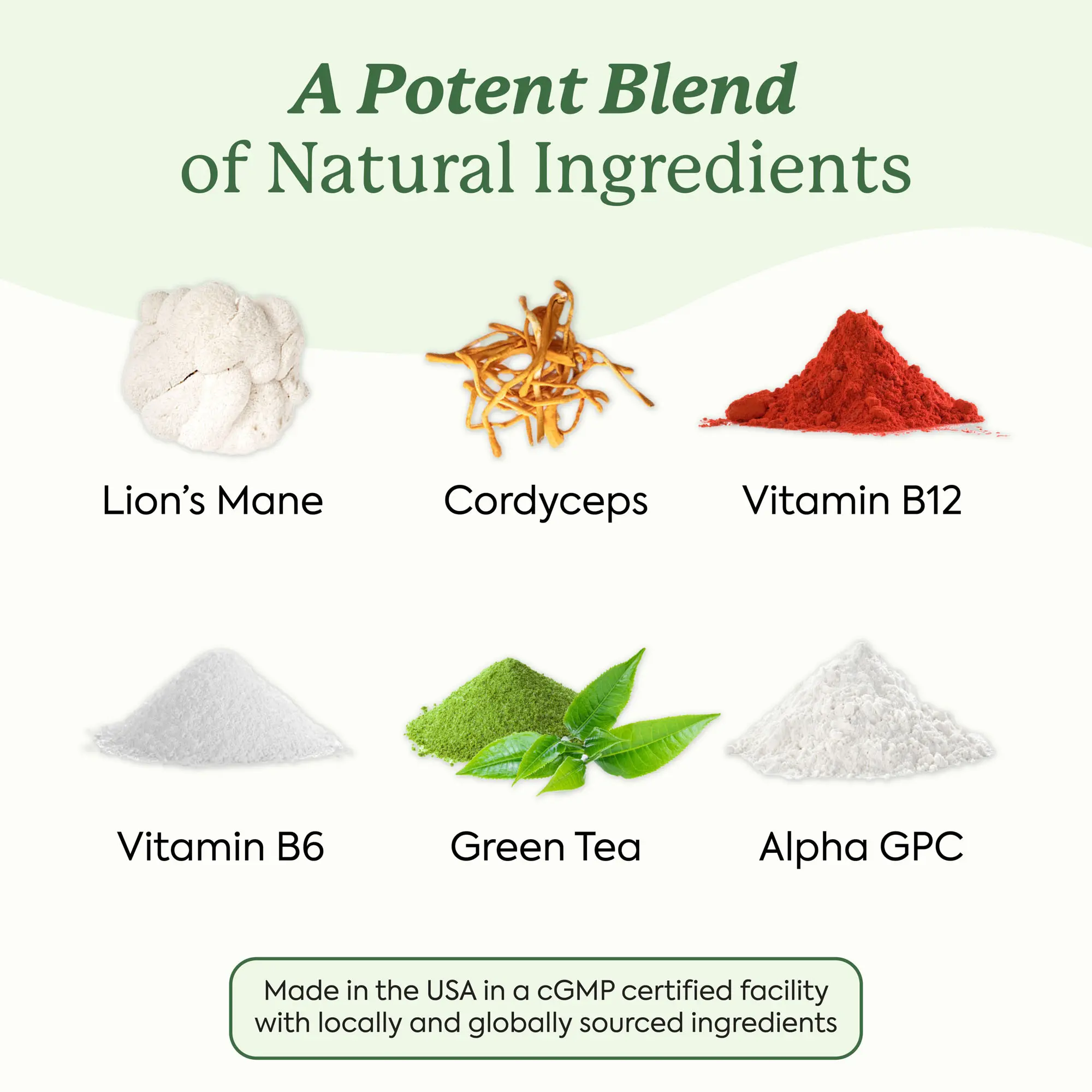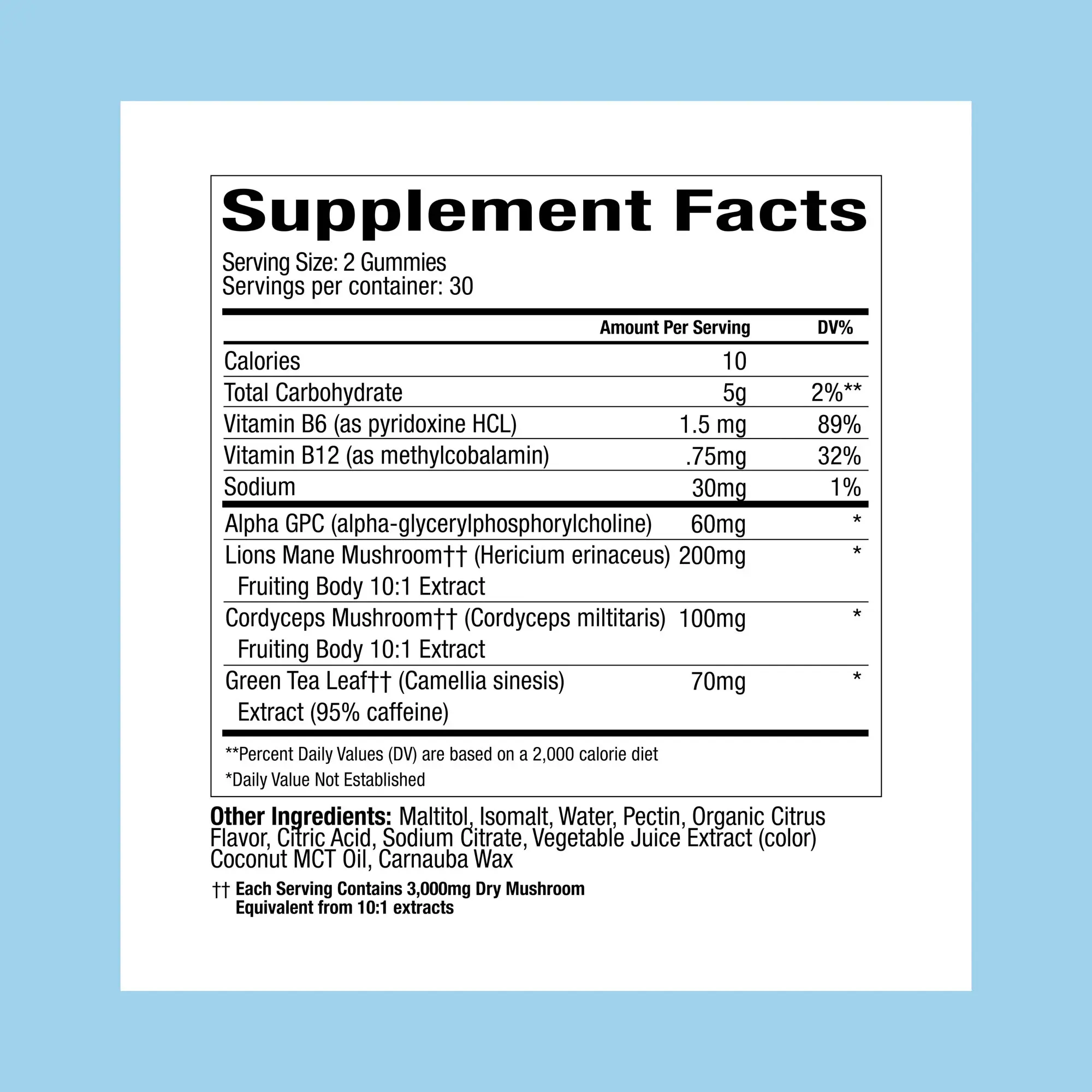 Active Ingredients: Lion’s Mane Mushroom Extract (200mg), Cordycep Mushroom Extract (100mg), Green Tea Leaf Extract (70mg), Vitamin B6 (1,500mcg), Vitamin B12 (750mcg), Alpha GPC (60mg). ;