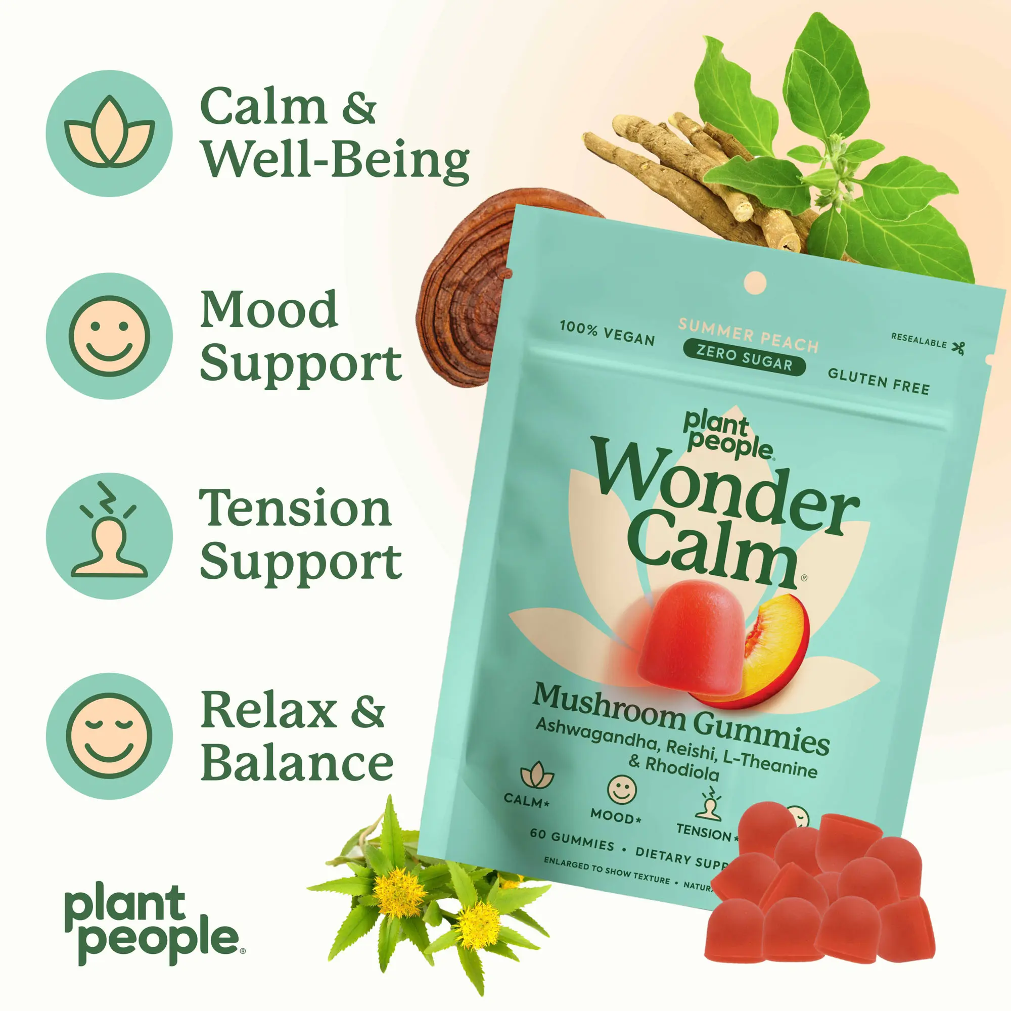 Each serving contains over 900mg of Ashwagandha, Reishi, L-Theanine and Rhodiola. 60 gummies per pouch. 30-Day supply.