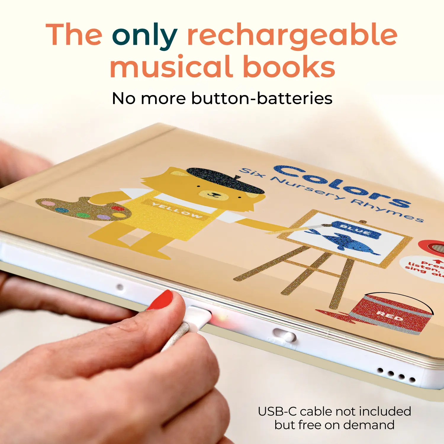 With a sound button on every page, your baby can explore music and colors at their own pace. The volume control and premium sound ensure playtime stays fun and just right for little ears. Plus, the rechargeable battery (USB-C charging, cable not included) means no messy battery changes—just plug in and power up for endless sing-alongs.