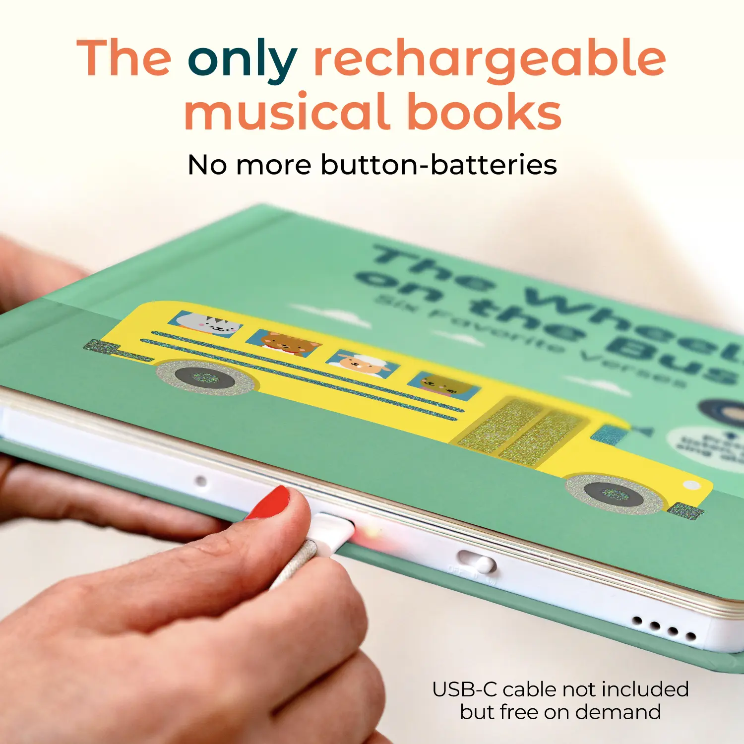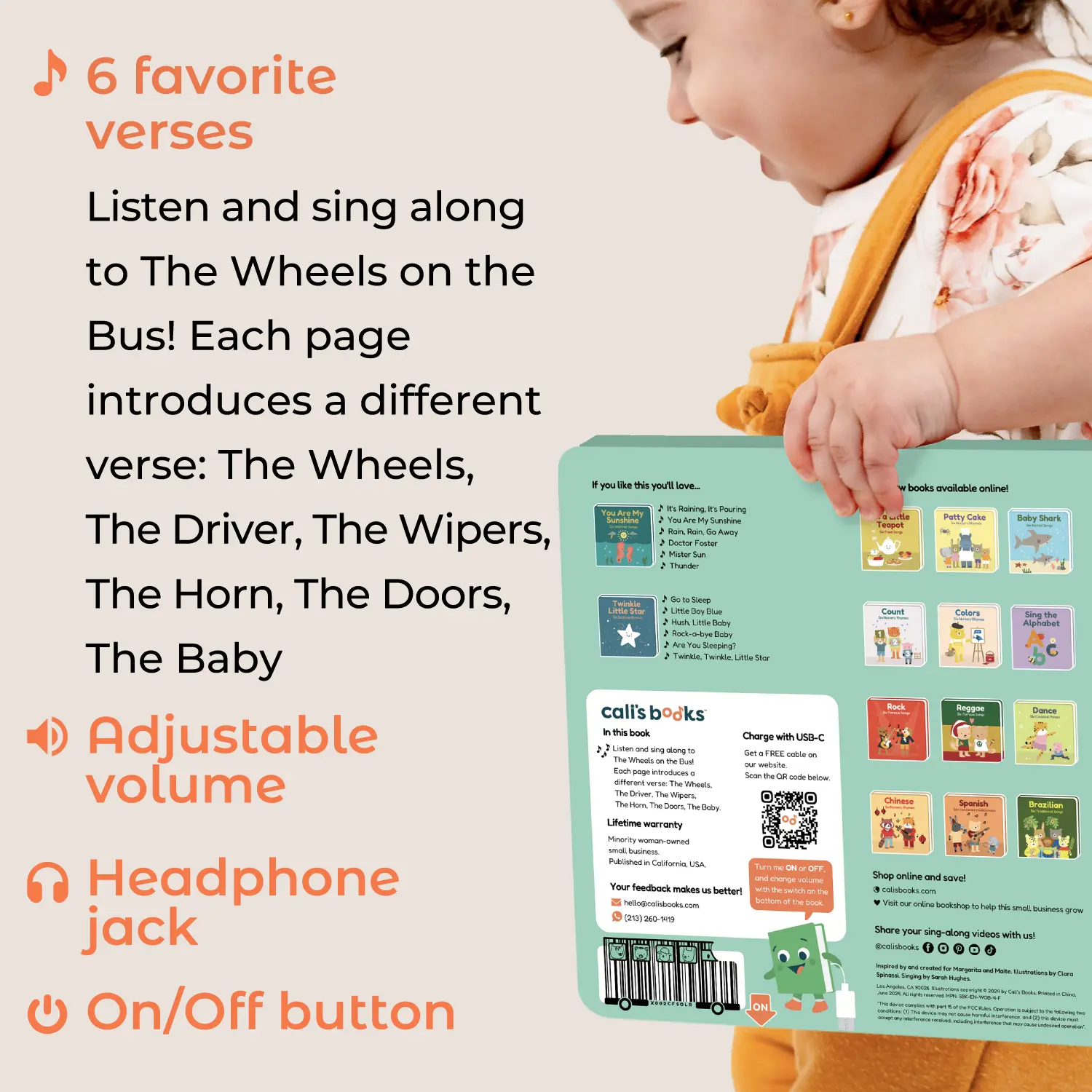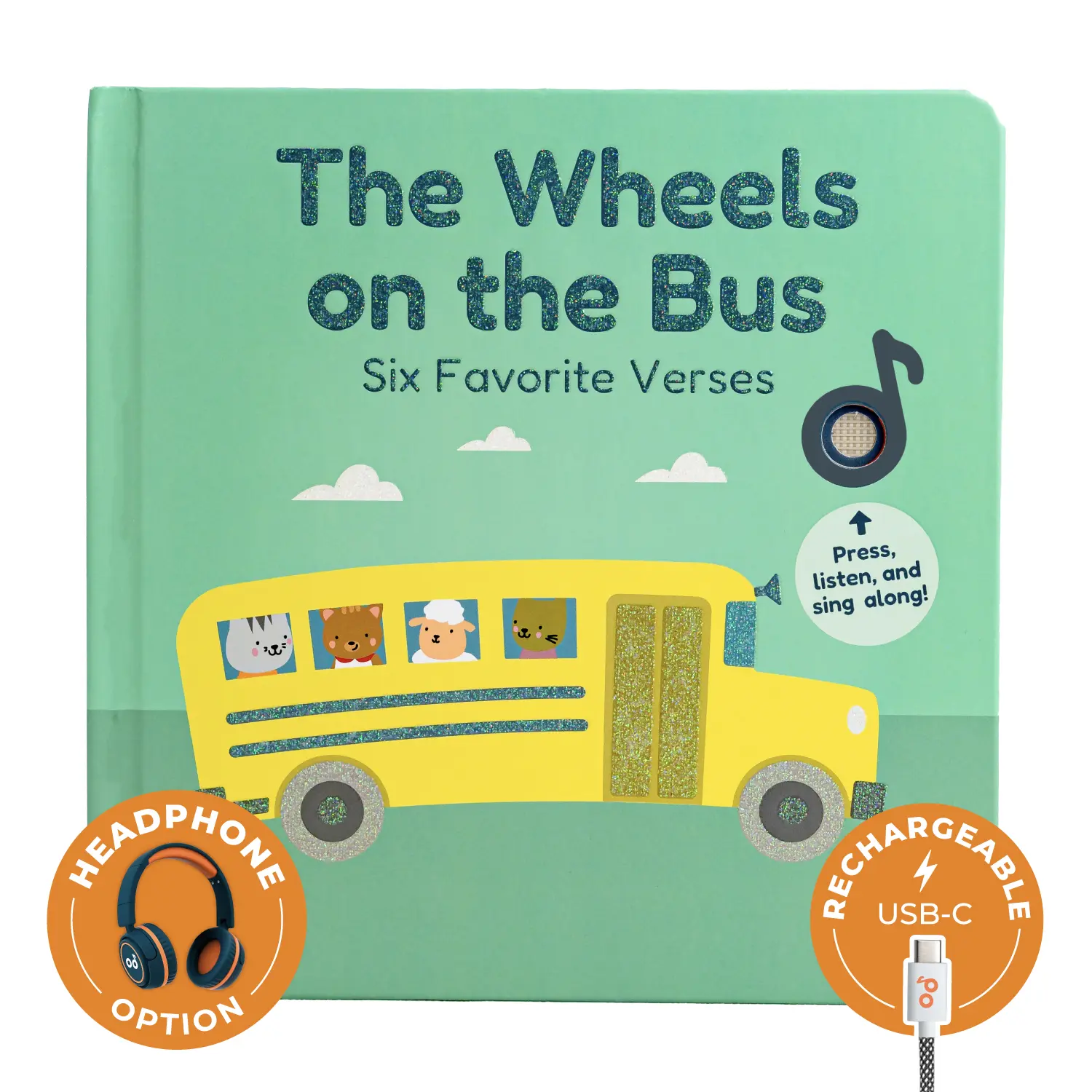 Ever wish storytime could be more interactive and musical? Cali's Books Wheels On The Bus Press and Sing Along Musical Book brings the classic nursery rhyme to life with six catchy verses and fun sound buttons. Your little one can press buttons to hear the bus horn, wipers, doors, and more, making learning playful and hands-on. This hardcover book is built tough for babies and toddlers, encouraging motor skill development and a love for books from the earliest age. It features a new volume control, improved speaker, and a headphone jack for quiet listening. The rechargeable lithium-ion battery charges via USB-C (cable not included), so the fun lasts longer without constant battery changes. Perfect for storytime or playtime, this musical book invites your child to sing along and explore sounds, making every page turn an adventure. Add this interactive gem to your child’s library and watch their eyes light up with every press and sing-along moment!