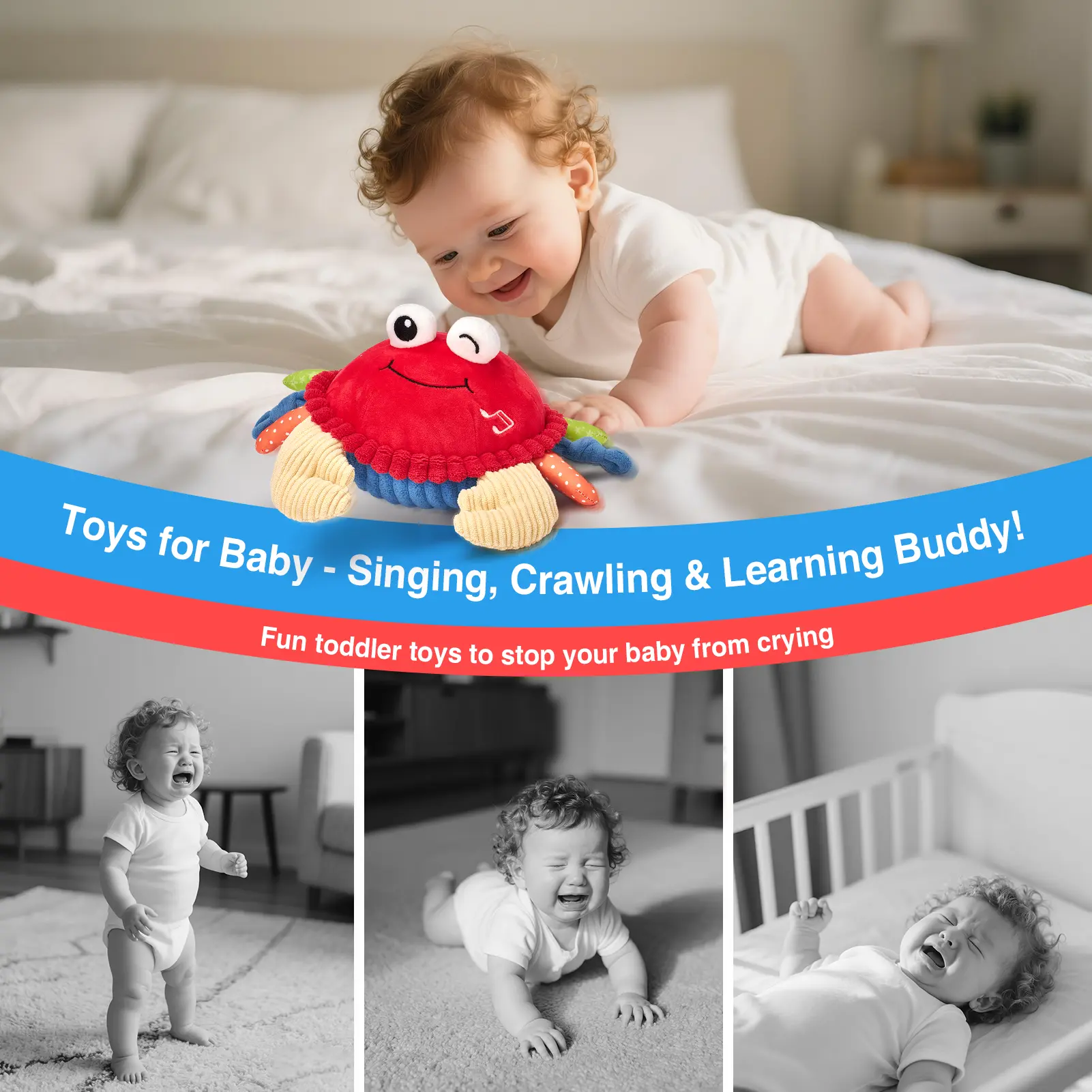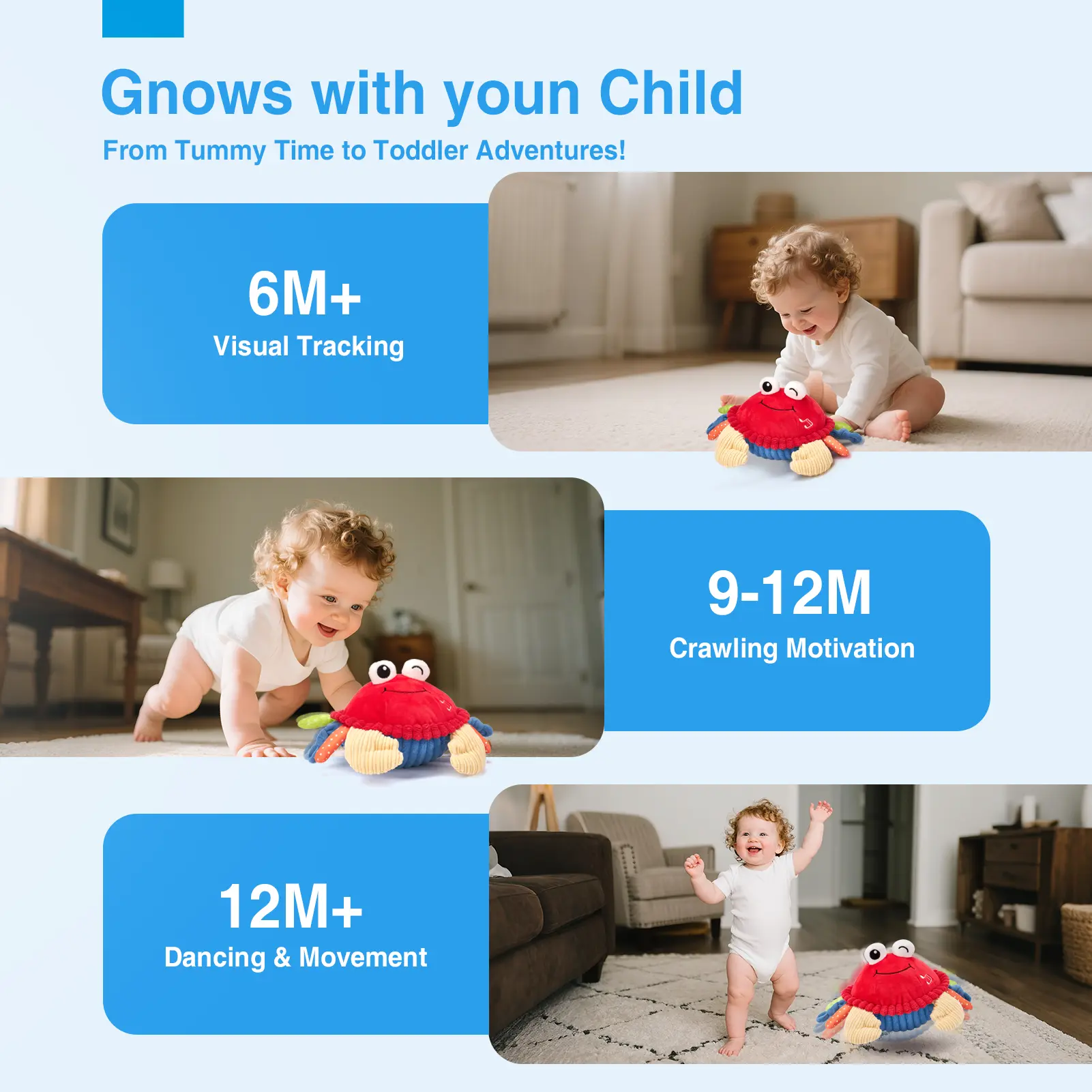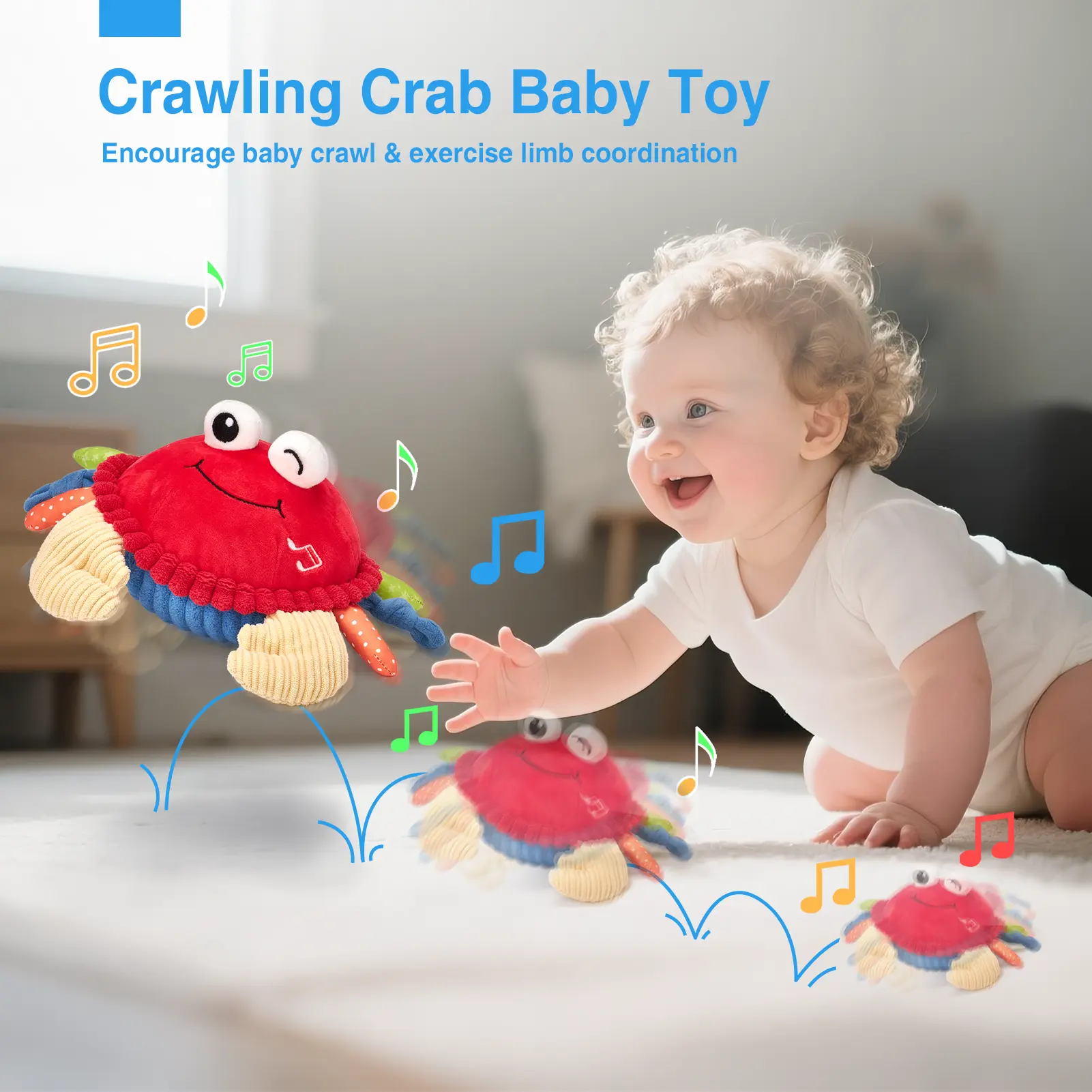 ·The dancing crab promotes crawling and gross motor skills. It moves and jumps like a real crab, encouraging babies to follow and play. Helps develop coordination and physical strength. Ideal for use on floors, carpets, and blankets.