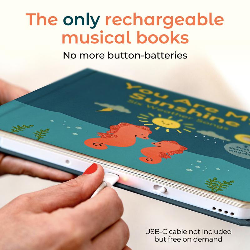 Each of the 6 sturdy hardcover pages features charming weather-themed illustrations, easy-press sound buttons, and lyrics for family singalongs—turning storytime into a lively musical experience. The volume control ensures the sound is just right, and crisp, clear speakers make every note sing. Plus, with a rechargeable USB-C battery (cable not included), you can keep the tunes going without constantly swapping batteries.