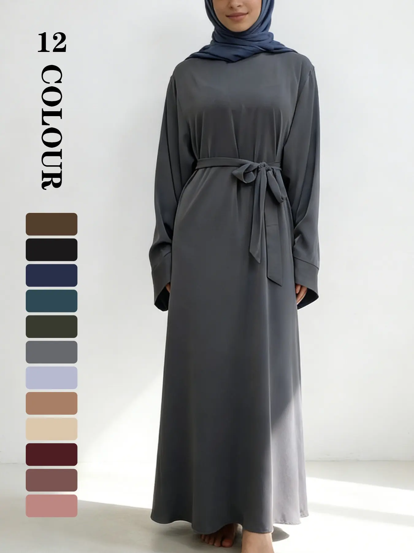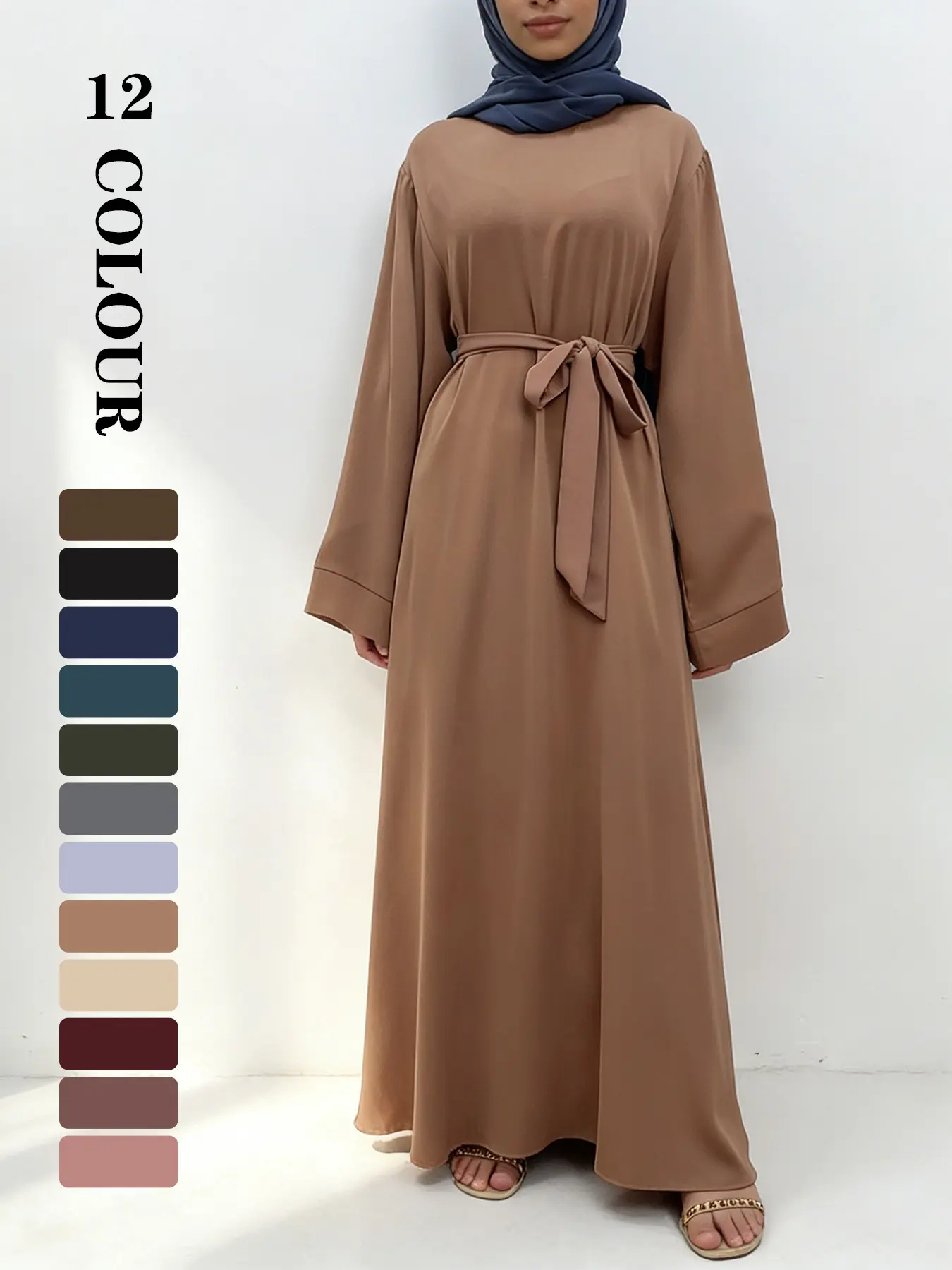 5. Muslim Modest Fashion Simple Nida High-Quality Long Sleeve Wide Sleeve Dress with Waist Belt, No Hijab Included, 12 Colors, 5 Sizes Available EID Ramadan Dress, Muslim Evening Dress