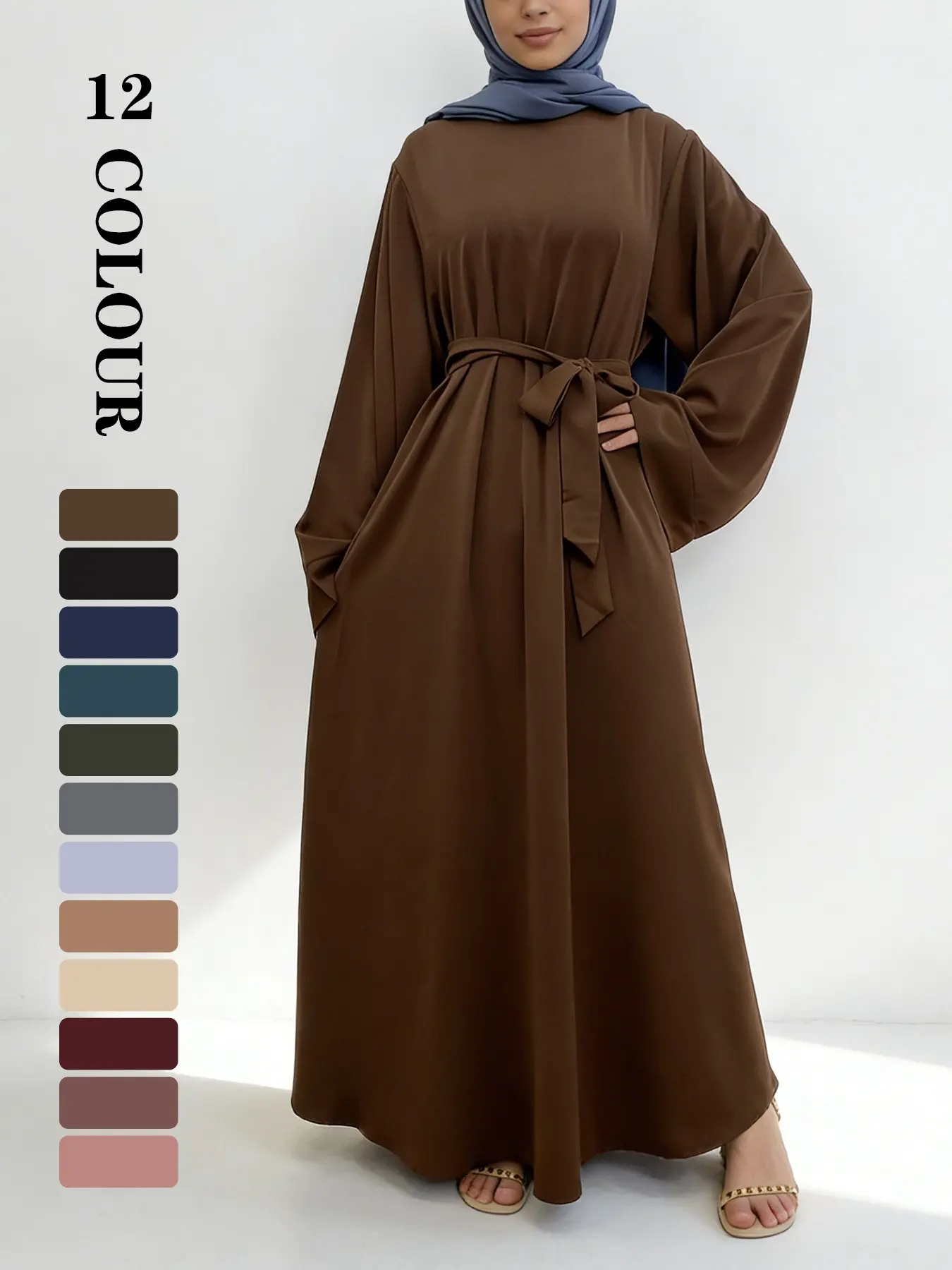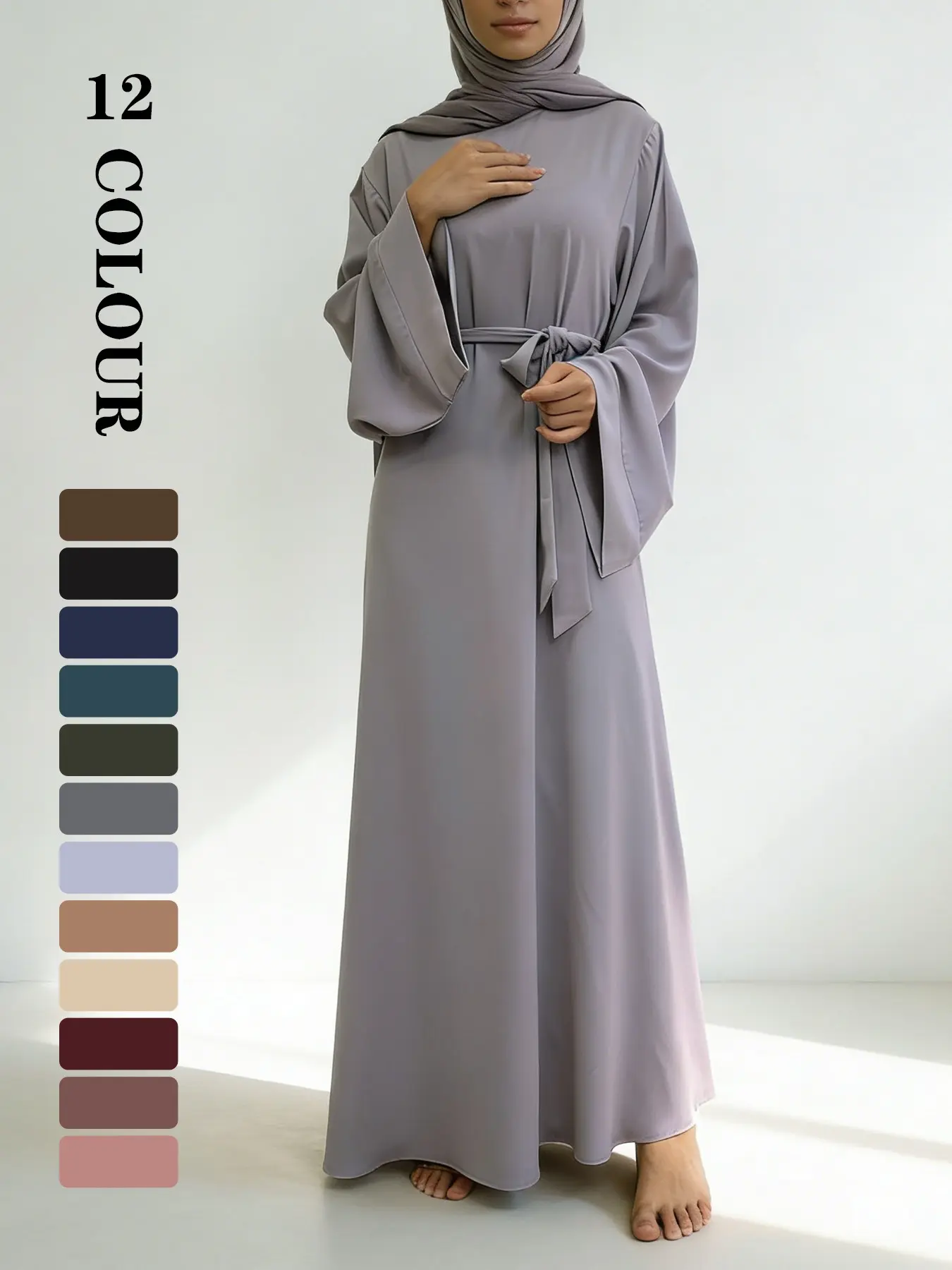 Muslim Modest Fashion Simple Nida High-Quality Long Sleeve Wide Sleeve Dress with Waist Belt, No Hijab Included, 12 Colors, 5 Sizes Available EID Ramadan Dress, Muslim Evening Dress