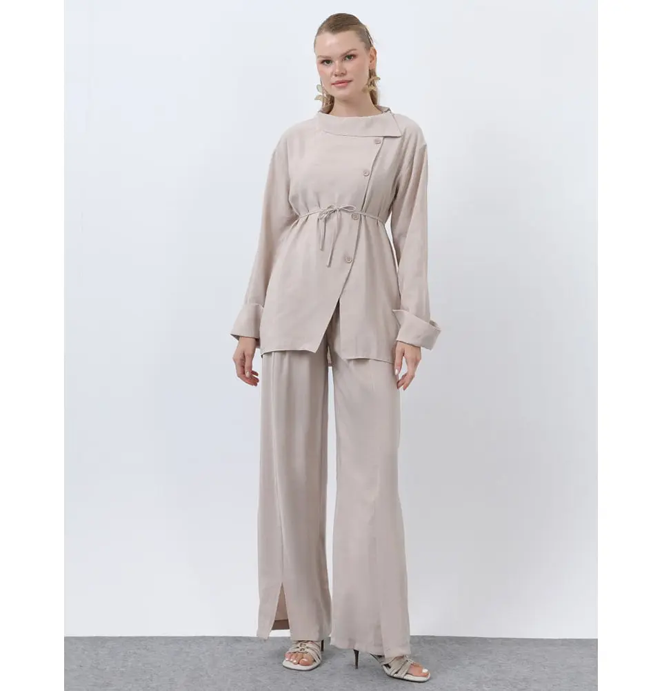 Muslim Women's Asymmetric Button-Detail Tunic & Wide-Leg Pants Set - 20677 Beige