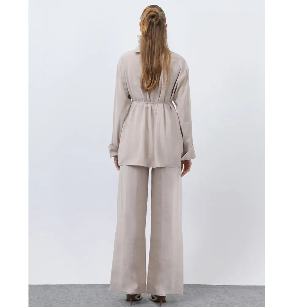 The tunic features an asymmetric front panel with decorative button details and a delicate waist tie for subtle shaping. Paired with fluid wide-leg pants, this set creates a balanced, elongated look that blends structure with graceful movement.