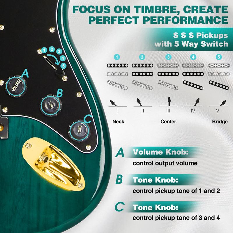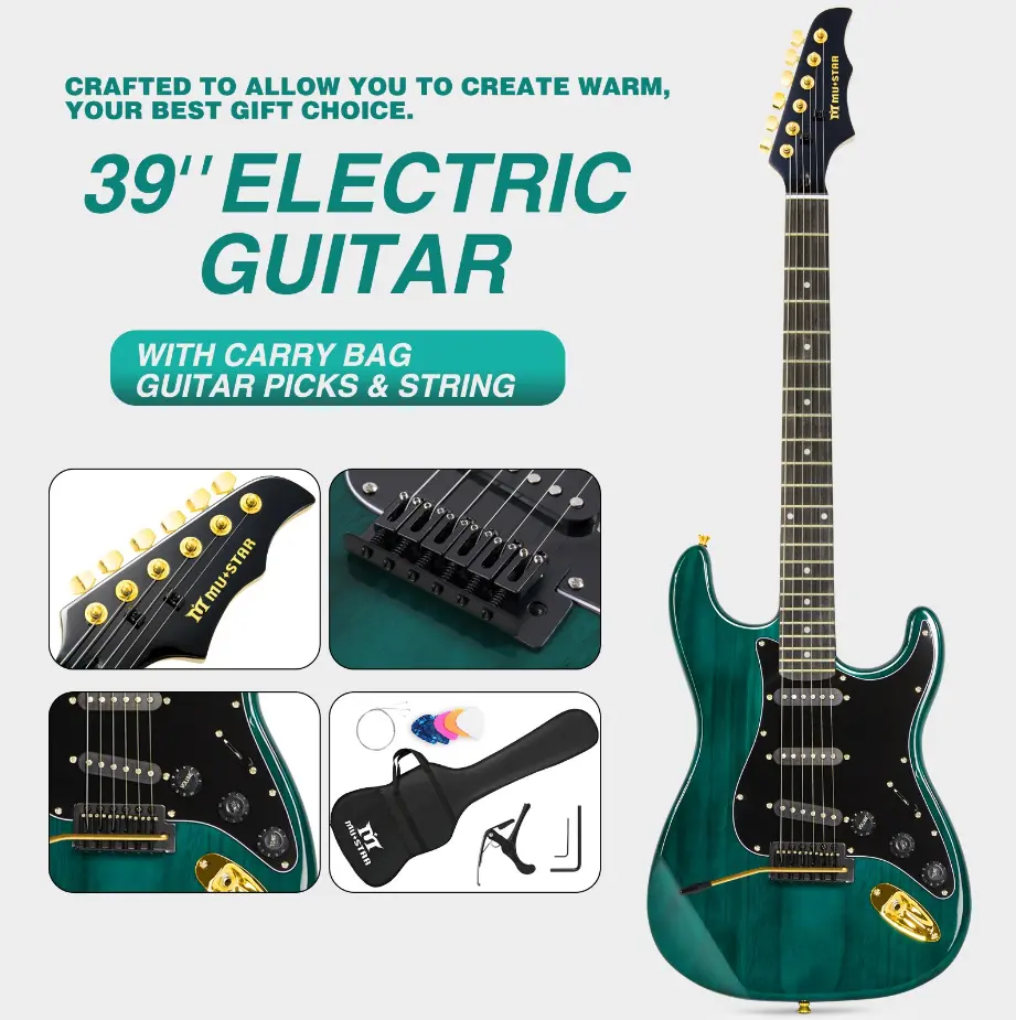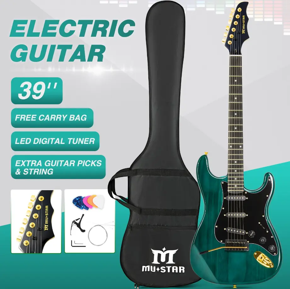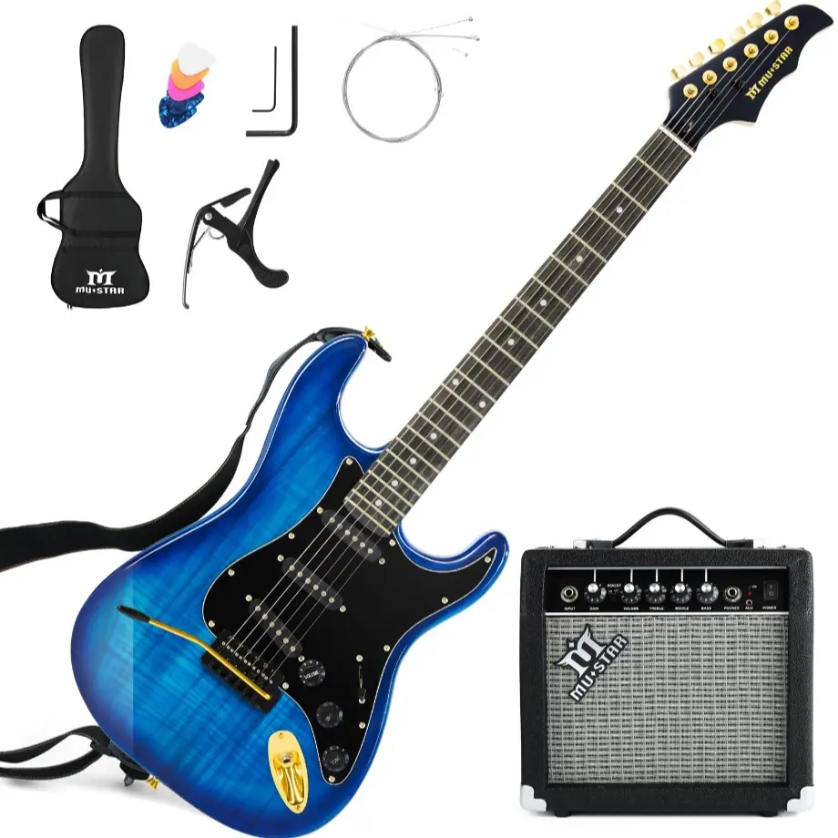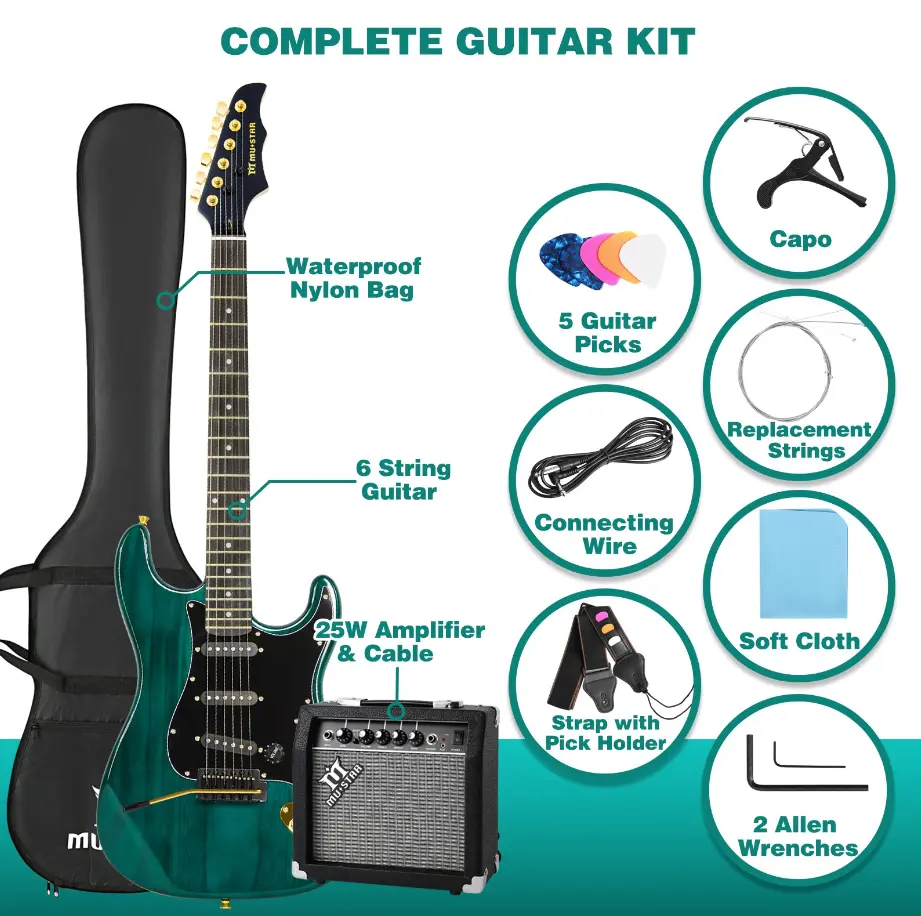Get started on your musical journey with the MUSTAR Electric Guitar Kit! This beginner-friendly set includes a 39-inch full-size solid wood electric guitar, a 25W amplifier, and essential accessories. Perfect for birthdays or holidays, it's a great gift for music enthusiasts. The kit comes with a gig bag, digital tuner, capo, strap, cable, and picks.