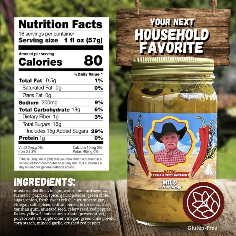 ·Ingredients: Mustard, distilled vinegar, water, mustard seed, salt, turmeric, paprika, spice, garlic powder, green chile, sugar, onion, fresh sweet relish, cucumber sugar, vinegar, salt, spices, sodium benzoate, xanthan gum, mustard seed, celery seed, red pepper flakes, yellow 5, potassium sorbate, polysorbate 80, apple cider vinegar, green chile powder, corn starch, minced garlic, crushed red pepper.