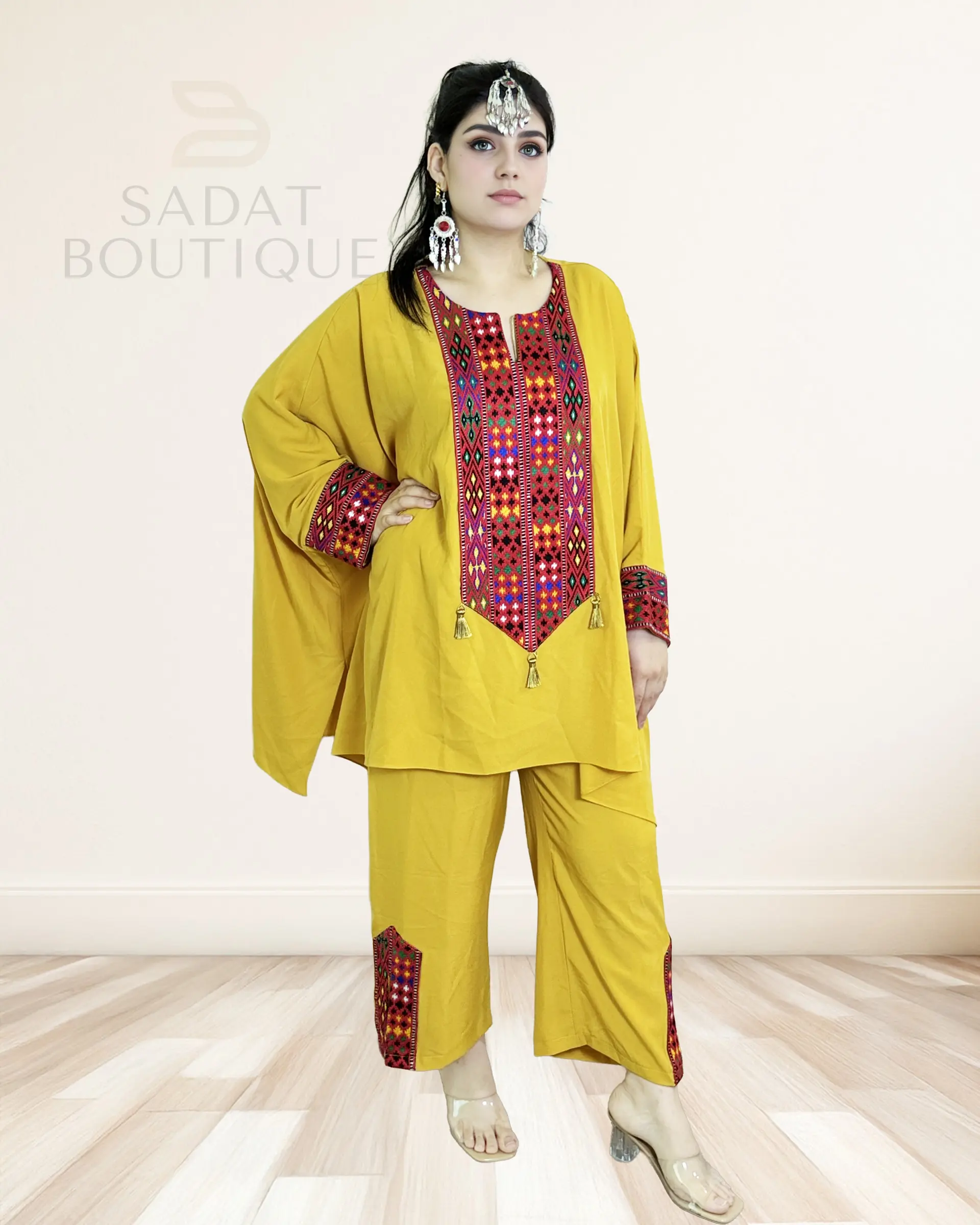 Title: Mustard Yellow Afghan Casual Set with Colorful Embroider