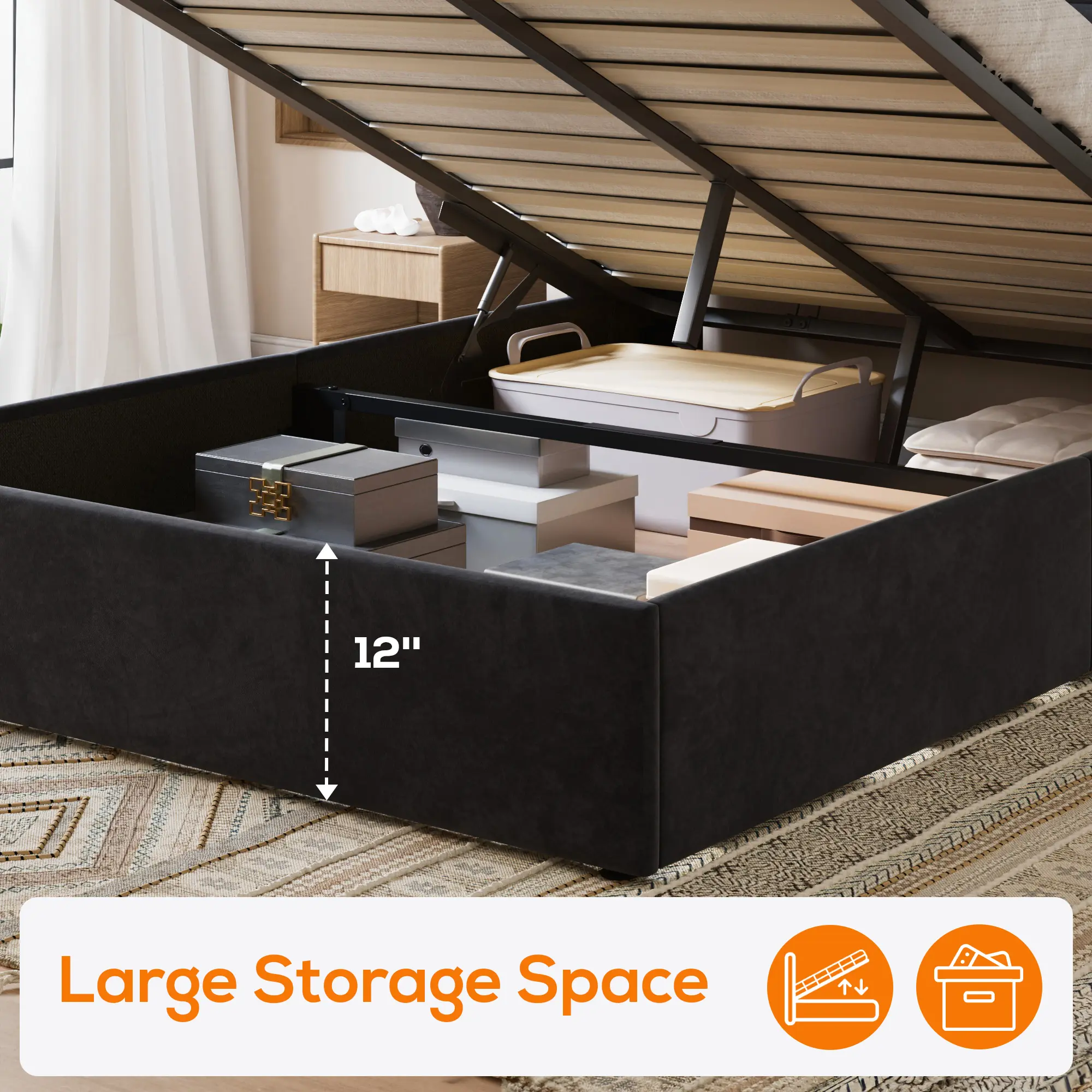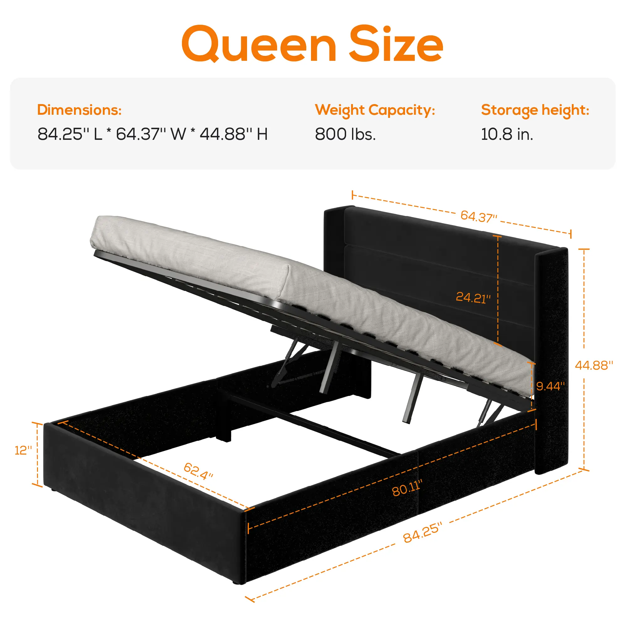 Lift up the platform with the smooth hydraulic system to reveal massive hidden storage—perfect for stashing seasonal clothes, bedding, or anything else cluttering your space.