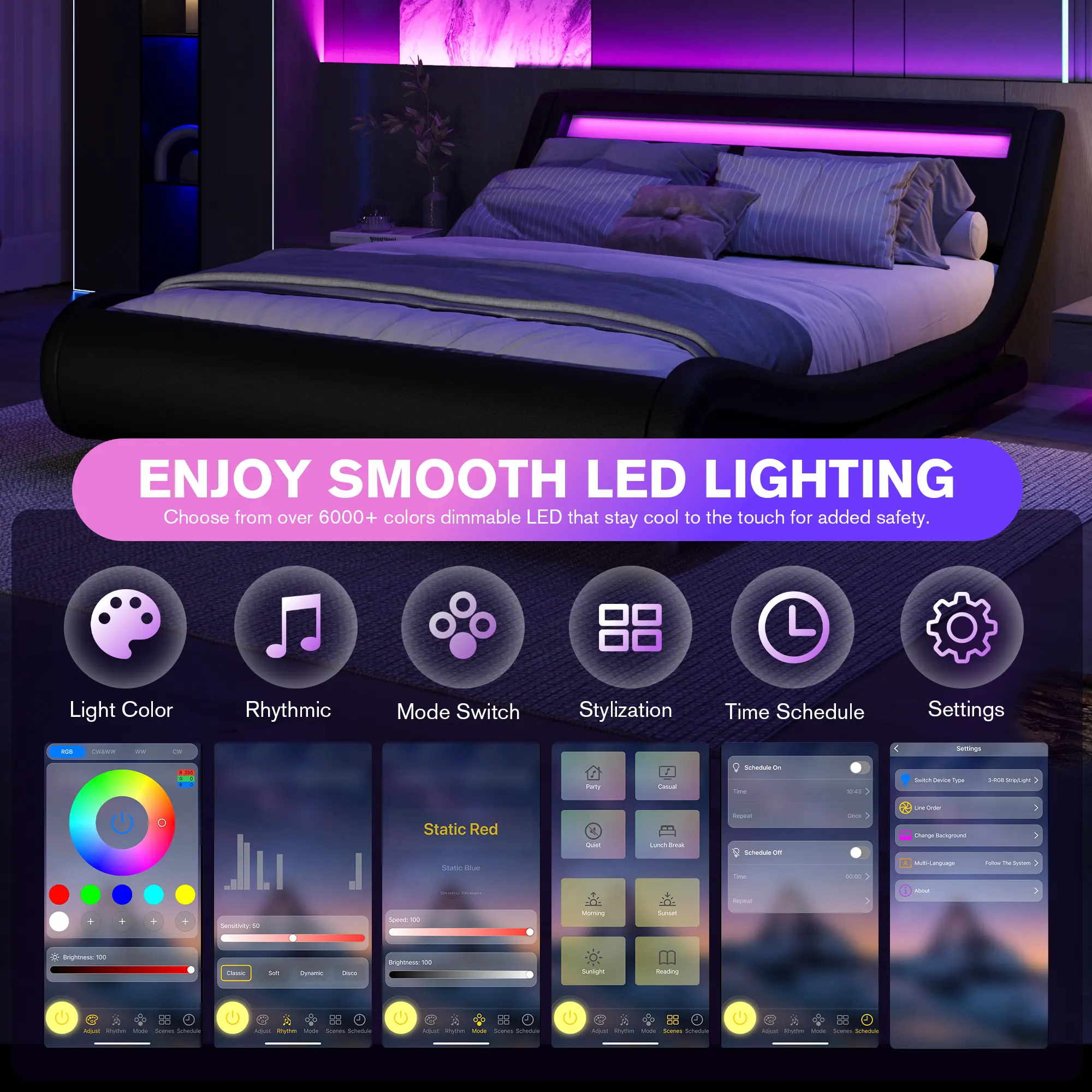Transform your bedroom ambiance with our cutting-edge LED headboard, featuring 16 vibrant colors, 6 adjustable brightness levels, and 4 dynamic lighting patterns. Whether you're setting a relaxing mood or adding a touch of modern flair, the customizable lighting ensures the perfect atmosphere for any occasion. Enjoy a soft, glare-free glow for a cozy nighttime retreat.