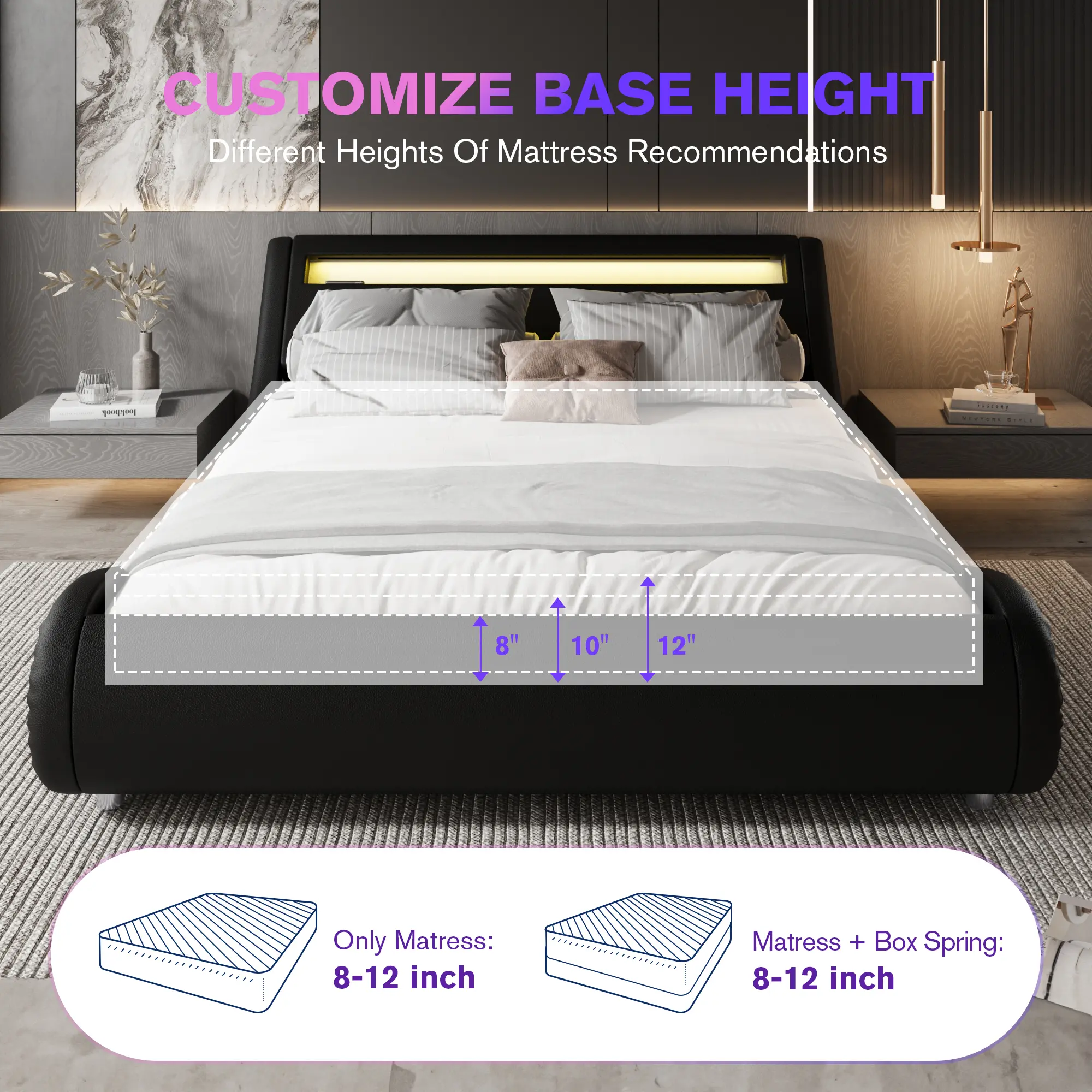 Built to support up to 600 lbs, this bed frame combines strength and reliability for peace of mind. Designed to pair perfectly with an 8-10" mattress, it ensures optimal comfort and a seamless fit for your sleeping setup.