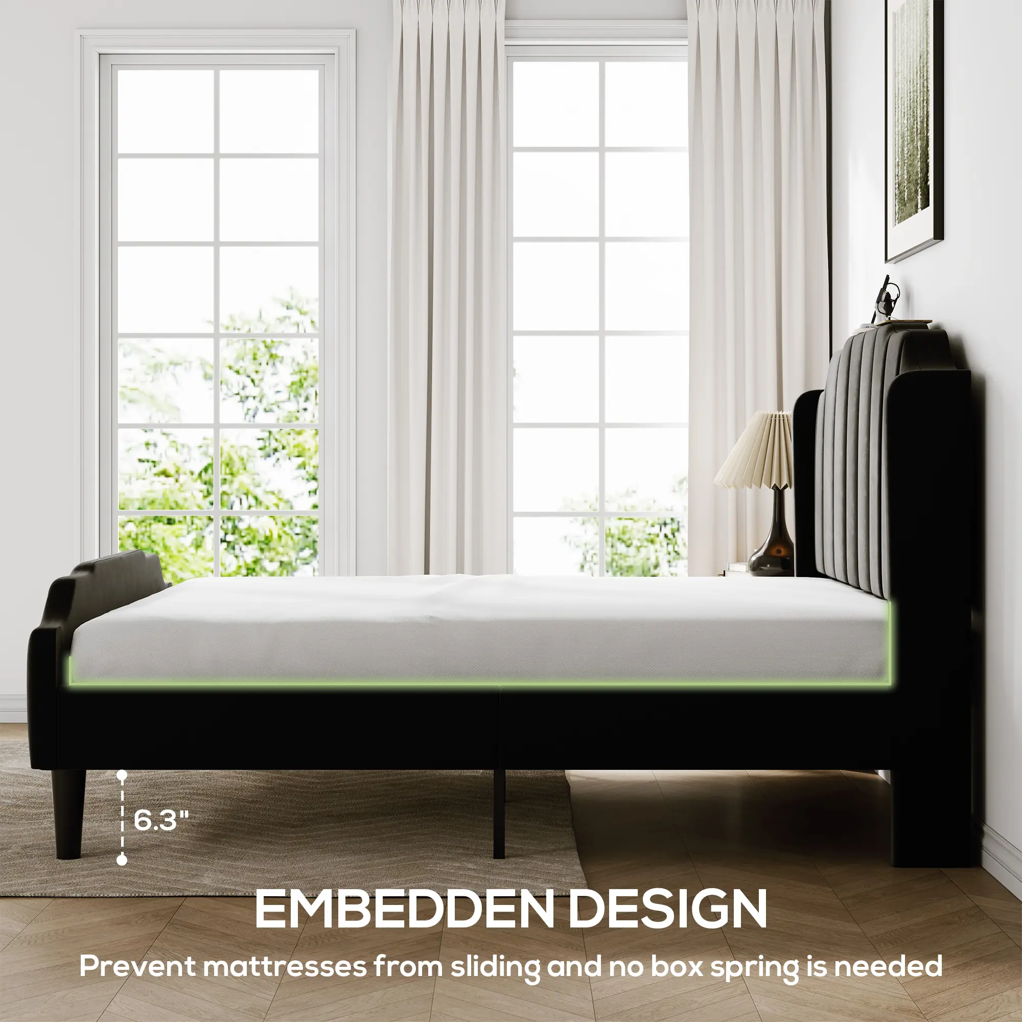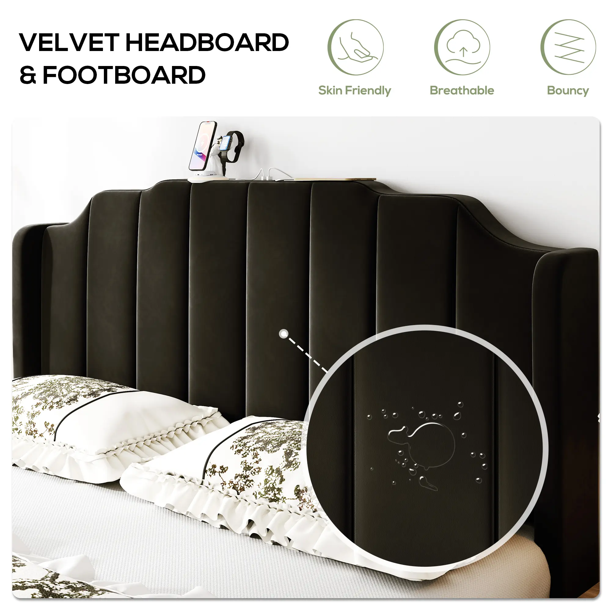 This MUTICOR Upholstered Bed Frame features a classic velvet headboard and footboard with built-in outlets for modern convenience. The structure is noise-free, easy to assemble with tools included, and made for durability. We back it up with worry-free returns for complete peace of mind.