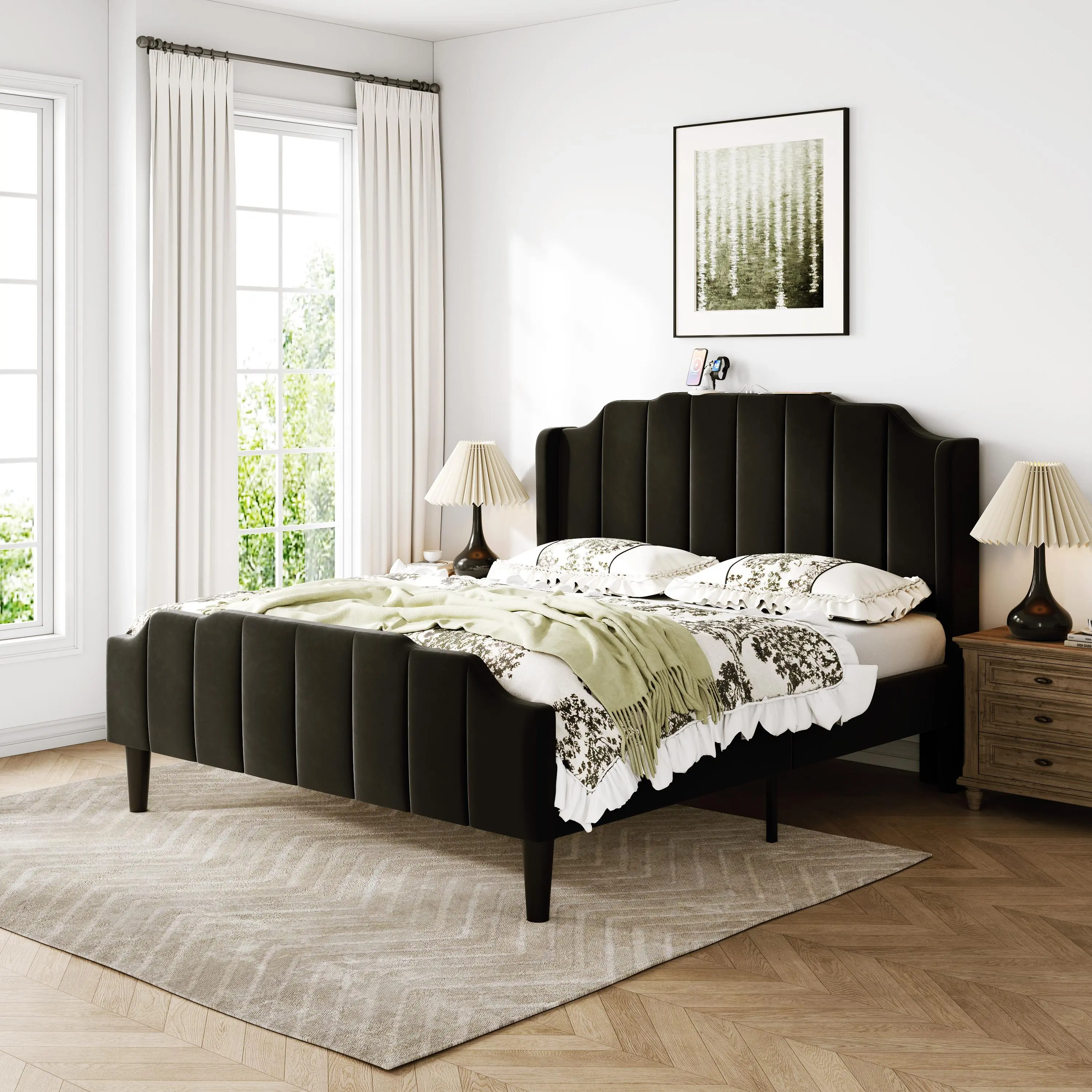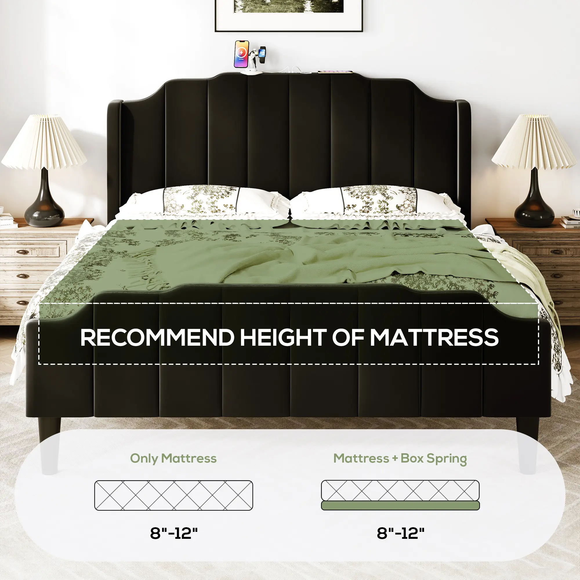 MUTICOR Upholstered Bed Frame with Power Outlets,Full/King/Queen Bed Frame, Velvet Classic Headboard & Footboard, No Box Spring Needed,Solid Wood Slats#TikTokShopBlackFriday #ChristmasGifts