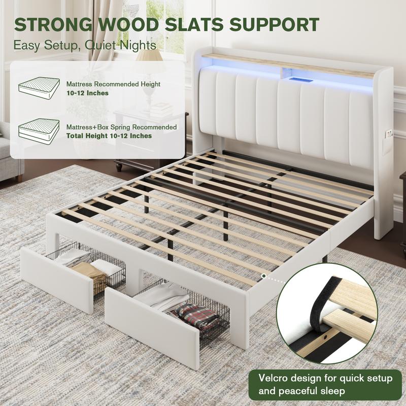MUTICOR Upholstered Bed Frame with LED Shelf Headboard & 2 Drawers