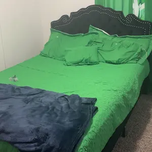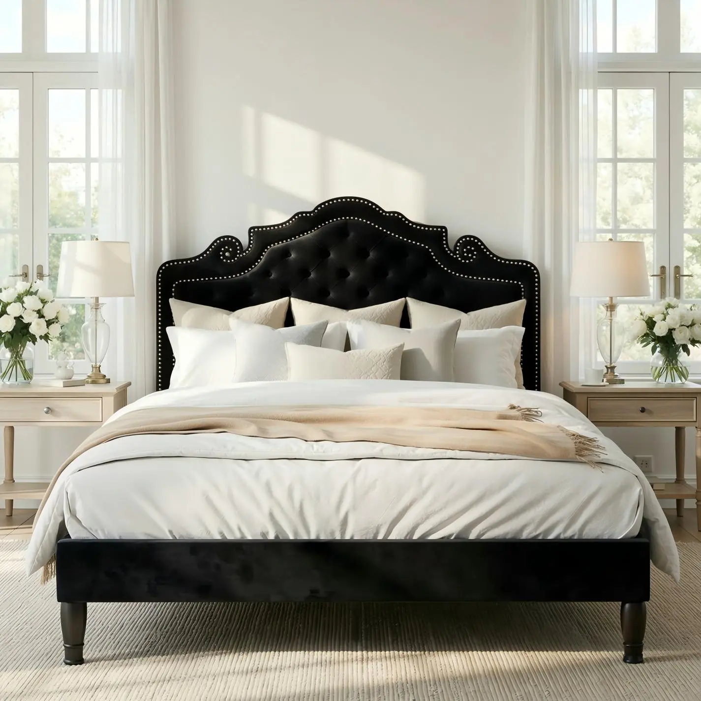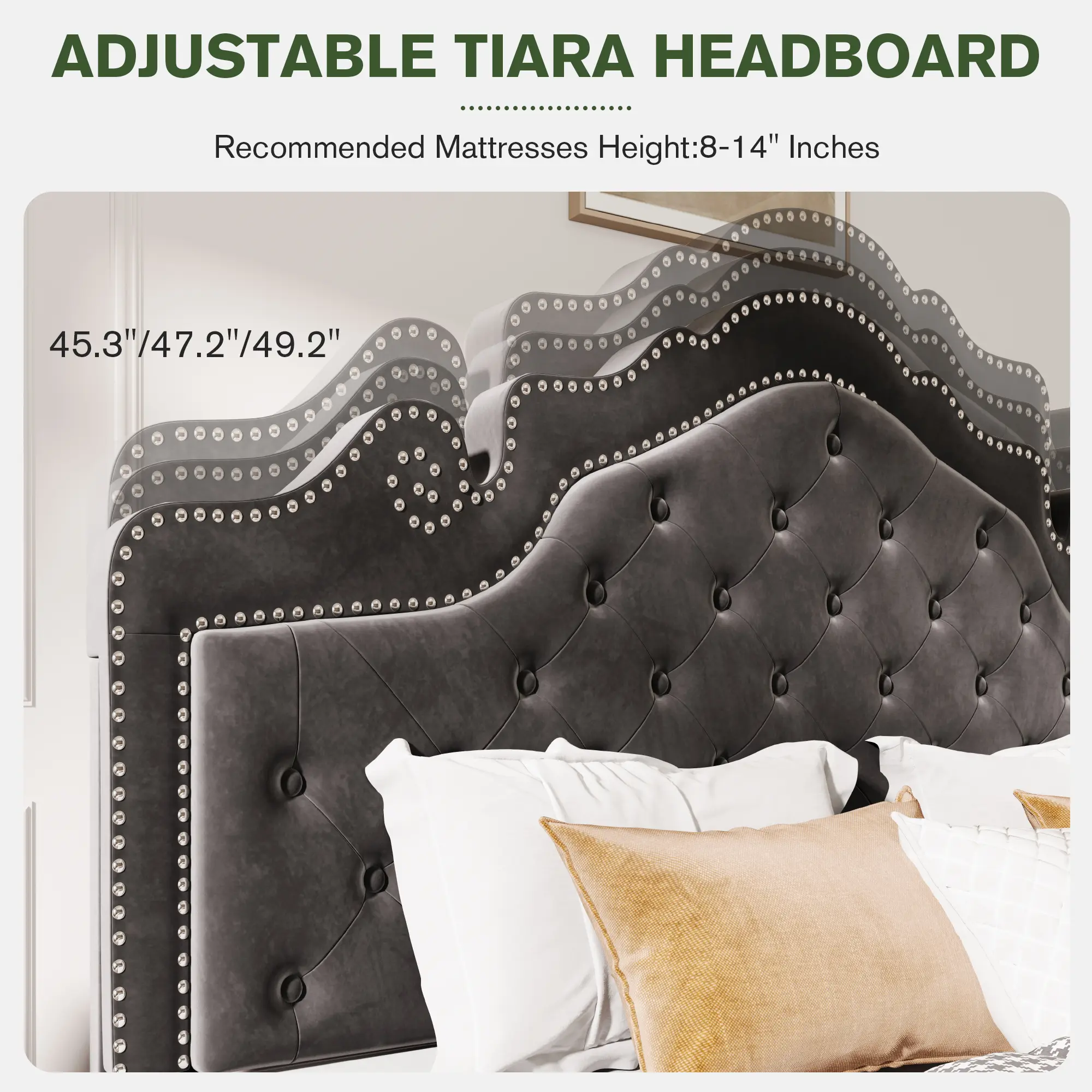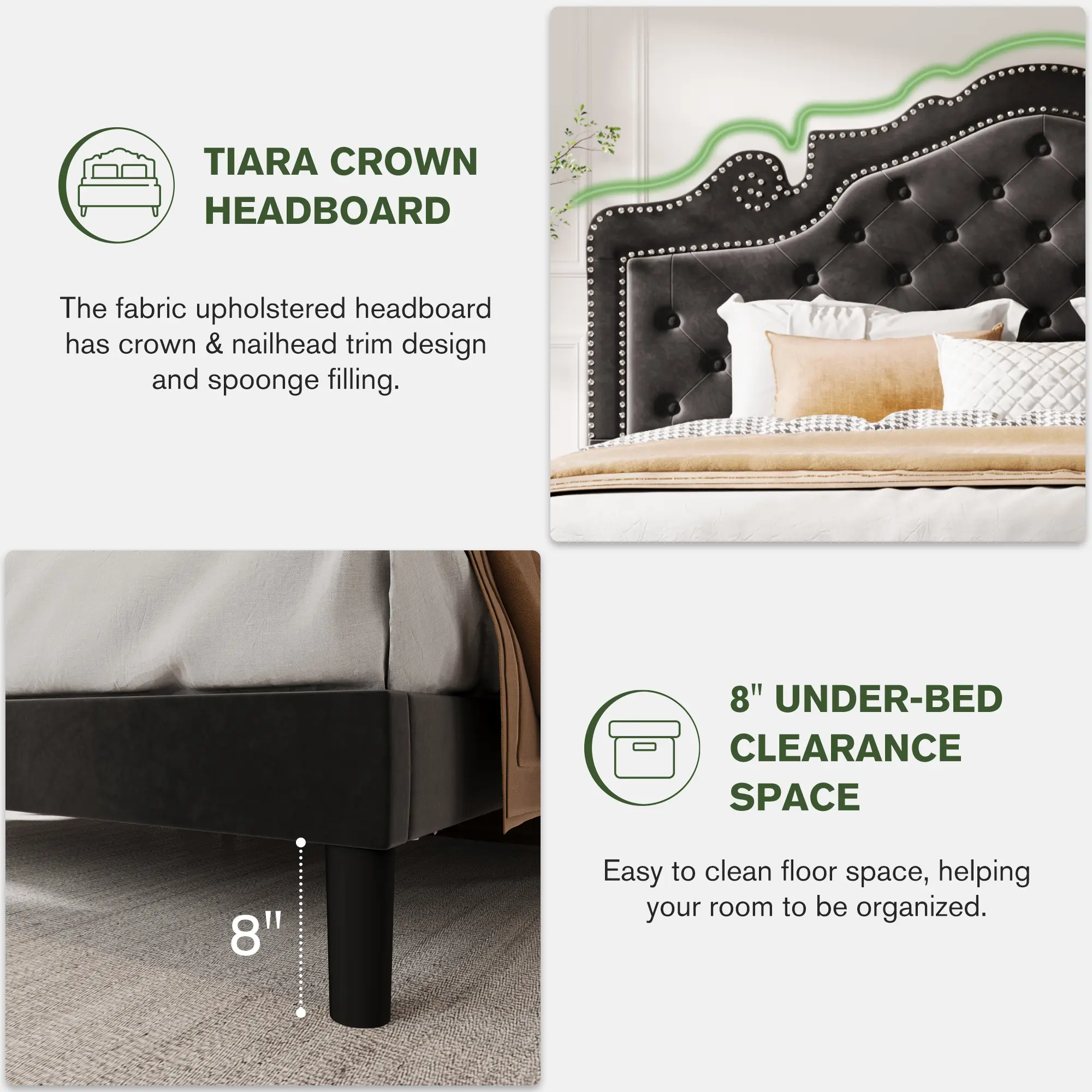 ·High-end appearance design: The stylish bed frame is upholstered in black velvet, paired with a crown-shaped studded headboard, showcasing a noble and elegant appearance, adding a luxurious atmosphere to the bedroom.