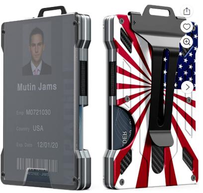 The Mutin Jams Wallet is a slim aluminum metal money clip designed for men. It features a clear window ID badge holder and RFID blocking technology. This wallet holds up to 15 cards and is ultra-thin, making it minimalist. Made from carbon fiber, it ensures durability and style. Perfect for those who prefer a sleek, functional wallet.
