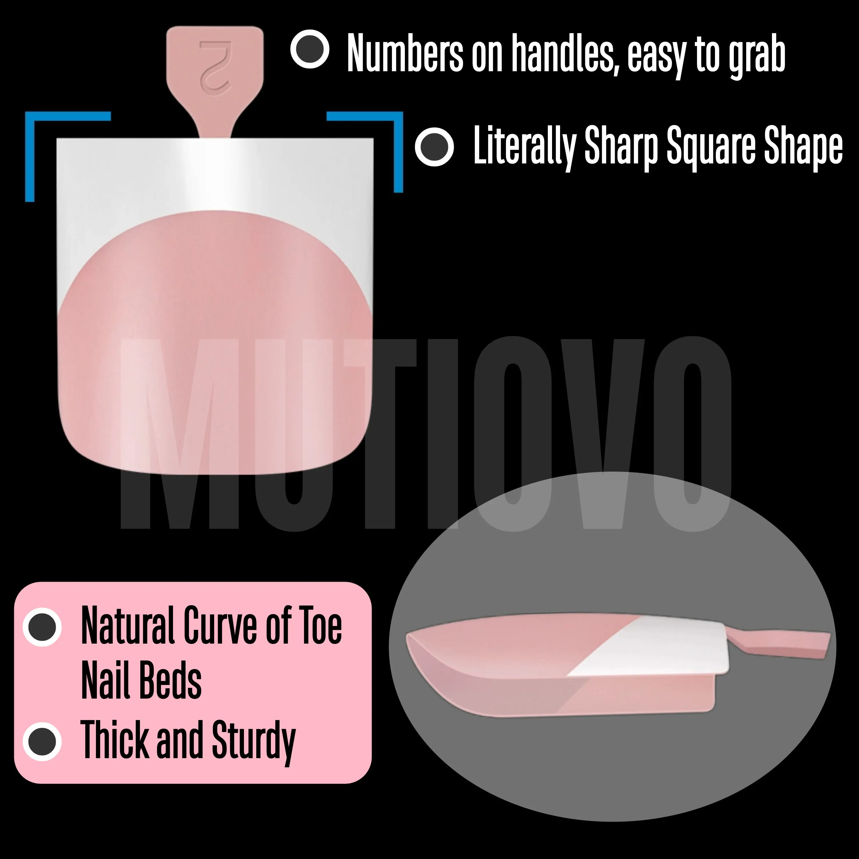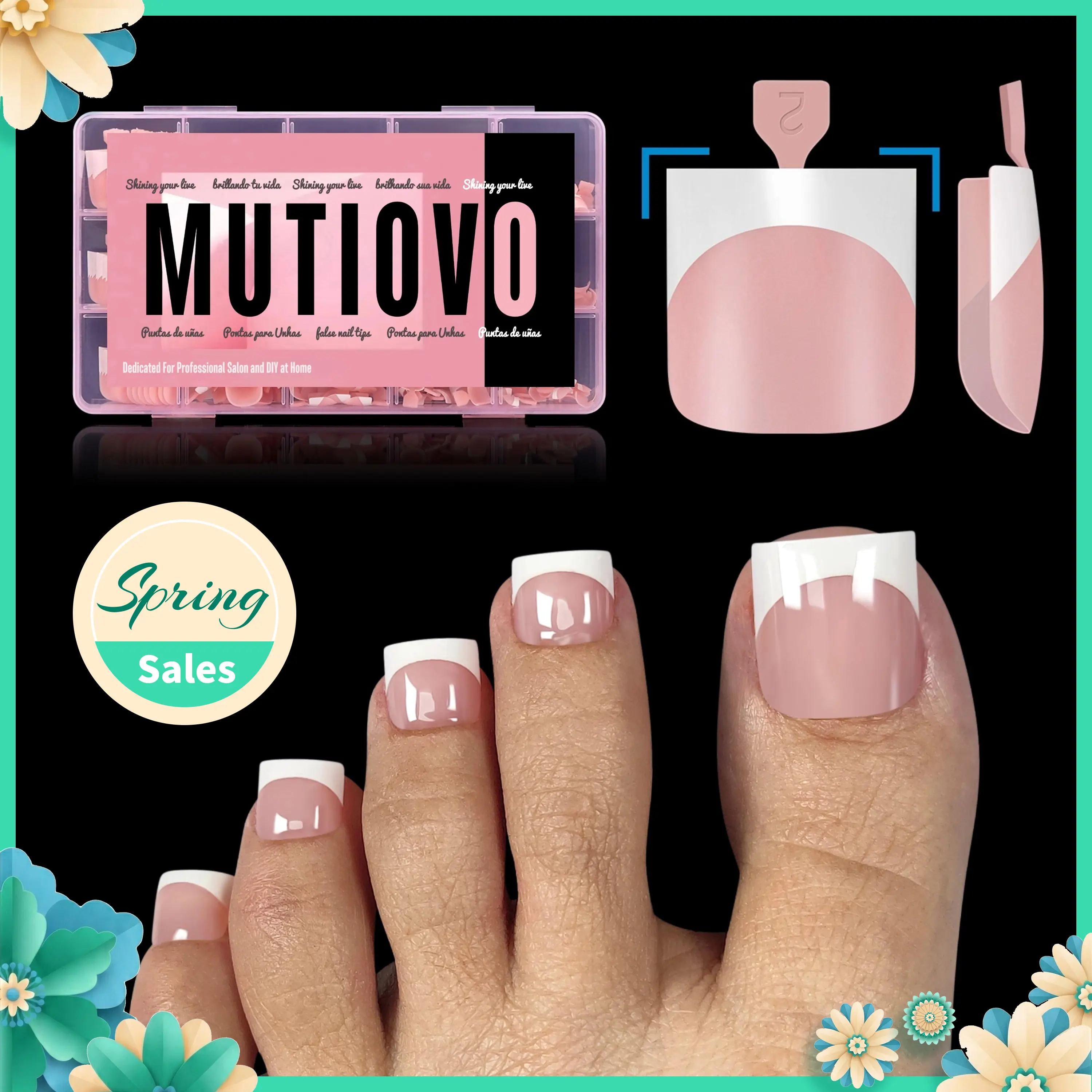 ¡GET THE PERFECT FRENCH TIP PEDICURE WITH JUST A FEW SIMPLE STEPS! MUTIOVO pre-designed nails are here to make your pedicure easier! We've already applied a tip primer and base coat on the soft gel nail tips. Simply stick them on your nails with UV gel or glue, then add a layer of builder gel and top coat. In just 15 minutes, you'll have stunning French tips on your toenails!