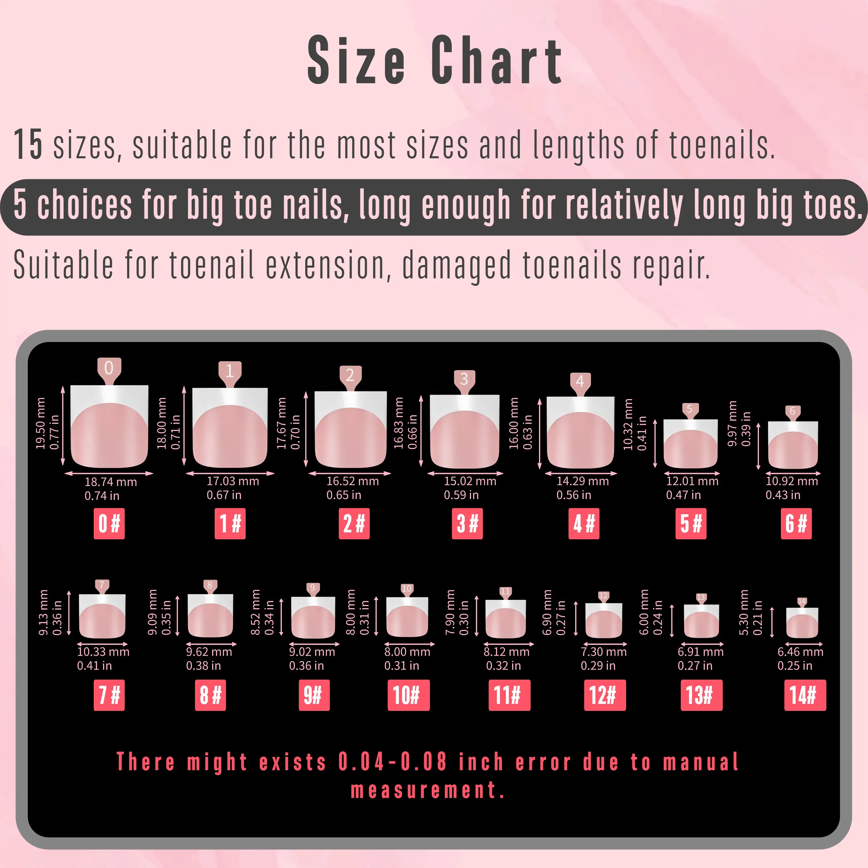 ¡COMPREHENSIVE SIZE RANGE: With 15 different sizes available for various toes and 5 size options specifically for the big toe, our nail tips are suitable for most foot sizes, especially wide toes, and can even be used by men.