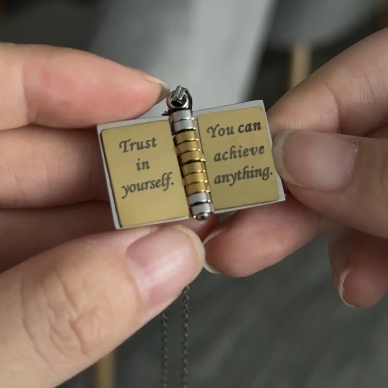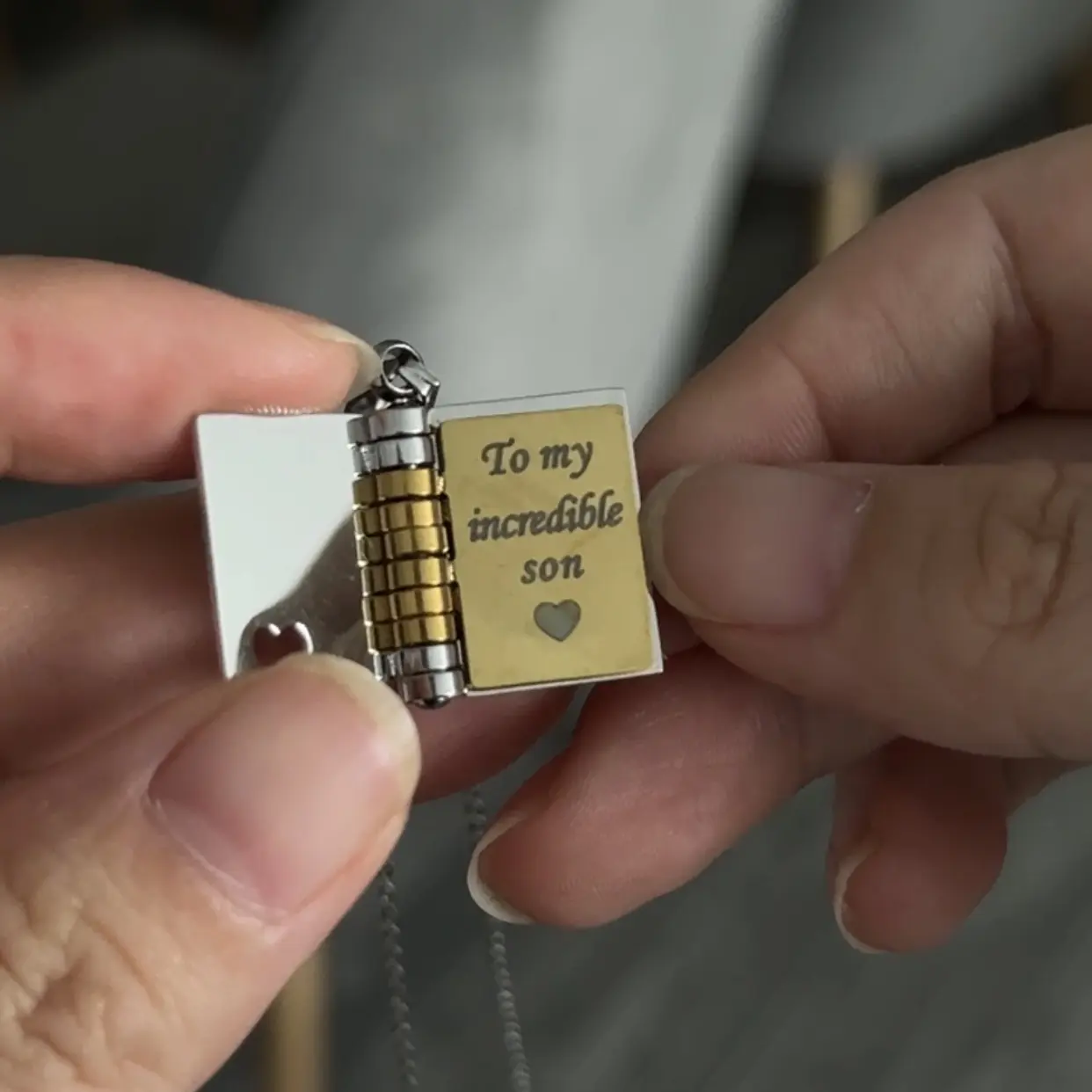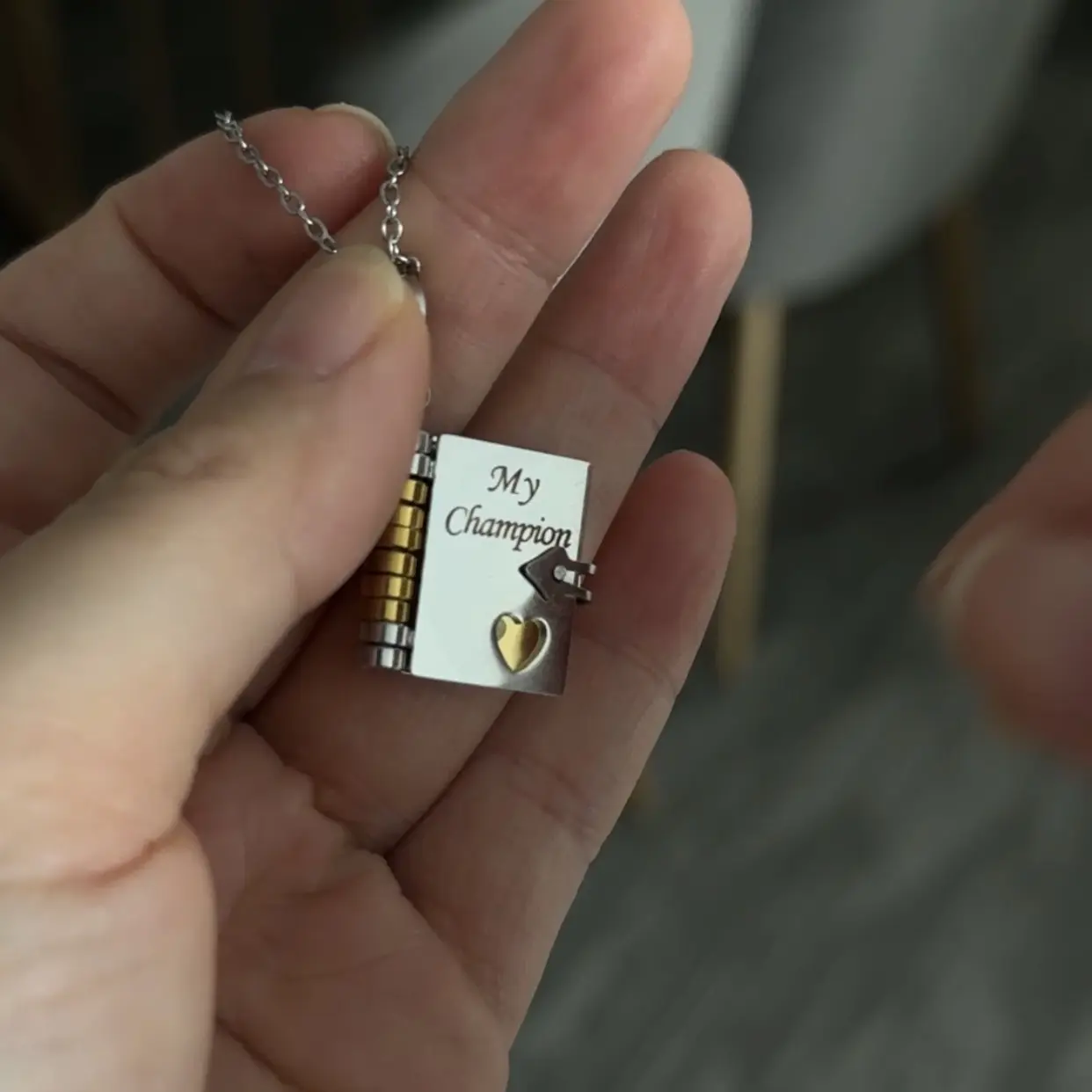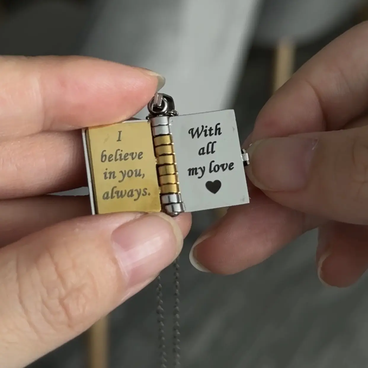 Celebrate your son's special moments with our My Champion Book Necklace. It features meaningful messages, creating a unique keepsake of your shared memories and love. Perfect for birthdays, graduations, or any occasion where you want to show pride. This pendant will remind him of your special connection daily.