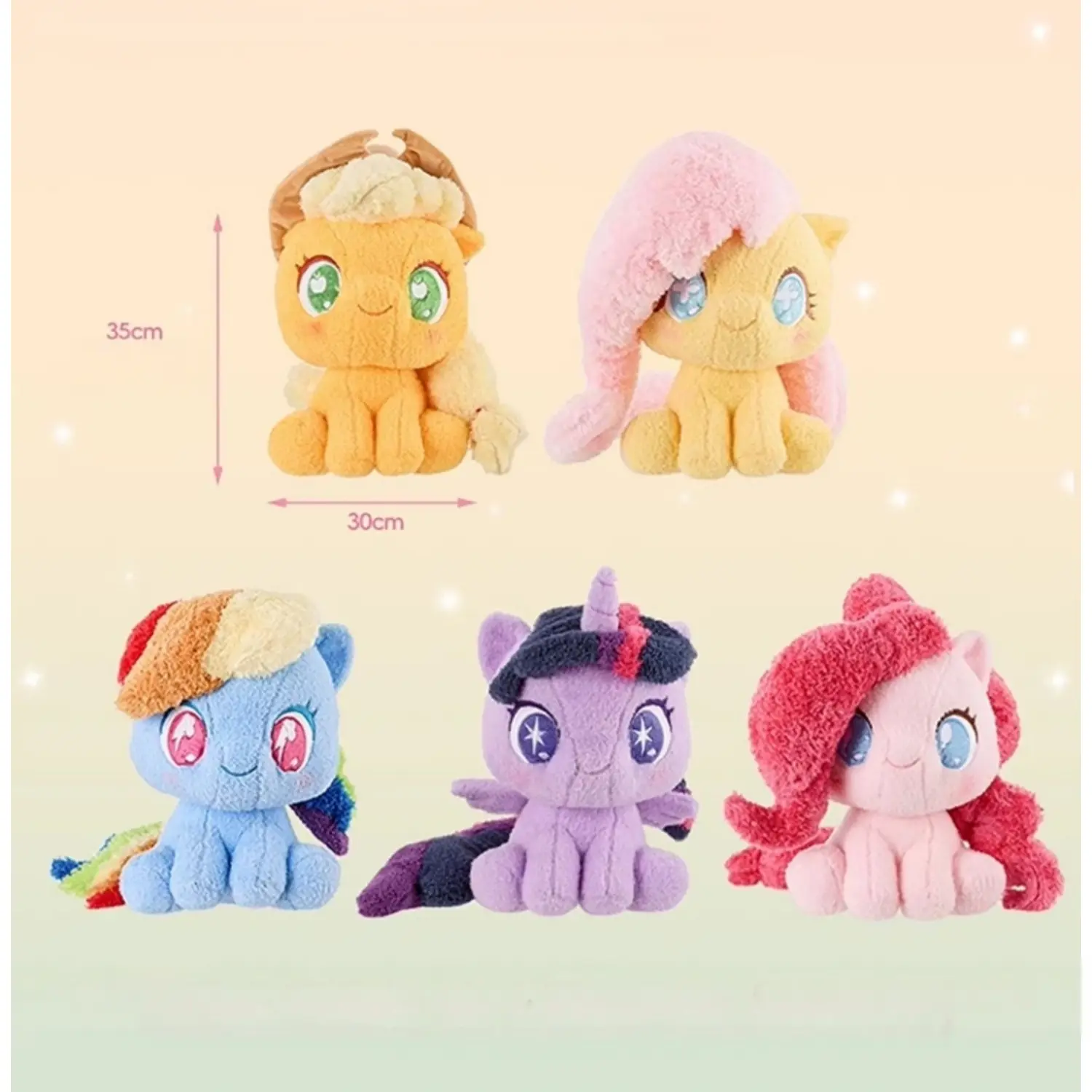 Each plush doll showcases a favorite My Little Pony character in a Q - version sitting pose: