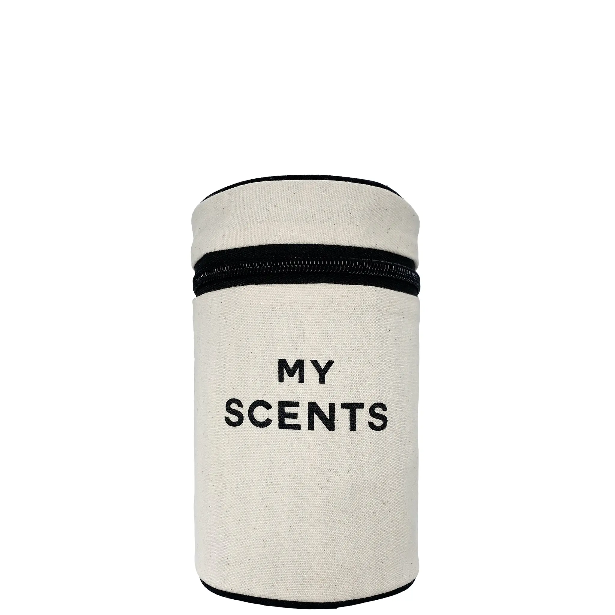 A round case designed to organize and store perfume bottles. Can be personalized with a monogram or embroidery. The case features Bag all’s signature striped wipeable lining to make cleaning easy. Smart rubber bands help keep products in place. Made from eco-friendly materials, this perfume case combines practical organization with thoughtful design. The case comes with 'MY SCENTS’ print on the front.
