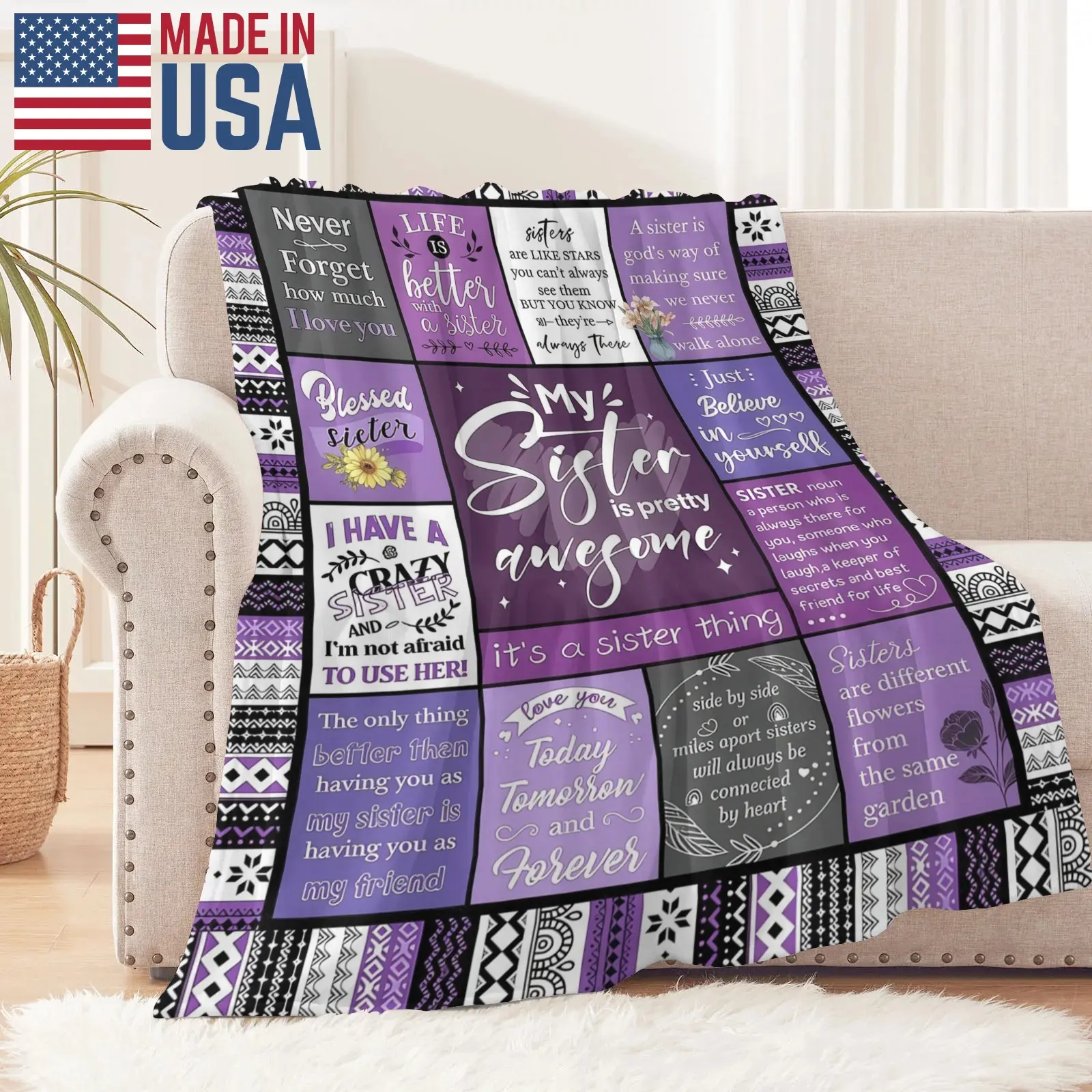 5. My Sister Flannel Blanket Soft Cozy Gift Throw with Heartwarming Sisterhood Quotes Stylish Purple Patchwork Design Perfect for Gifting Snuggling or Adding Sweet Bonding Charm to Any Home Space