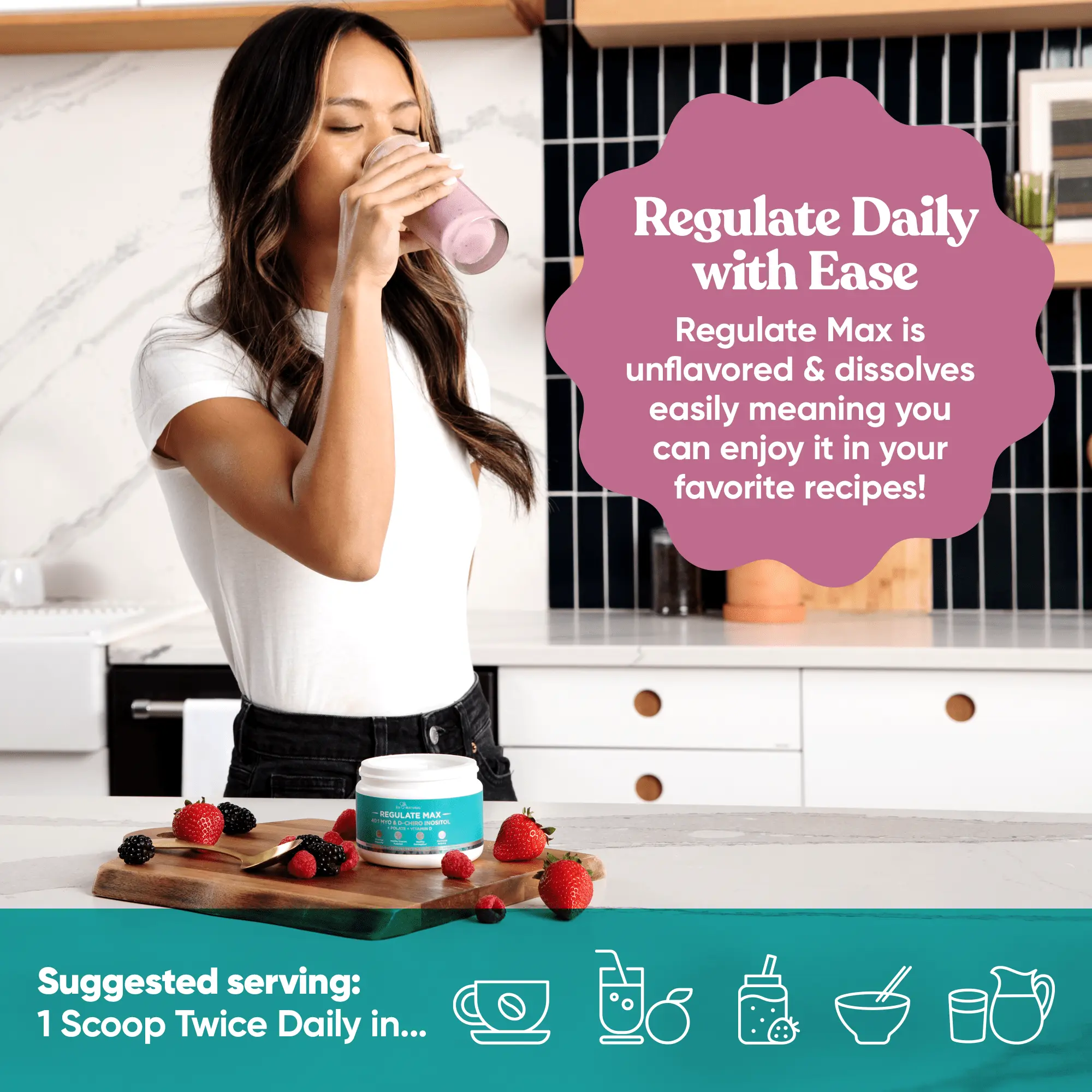 Bring balance to your daily routine with Regulate MAX, a clean blend of Myo-Inositol, D-Chiro Inositol, Vitamin D & Folate. This easy-to-mix powder is designed for simple, everyday support—just stir into water, juice, or your favorite smoothie.