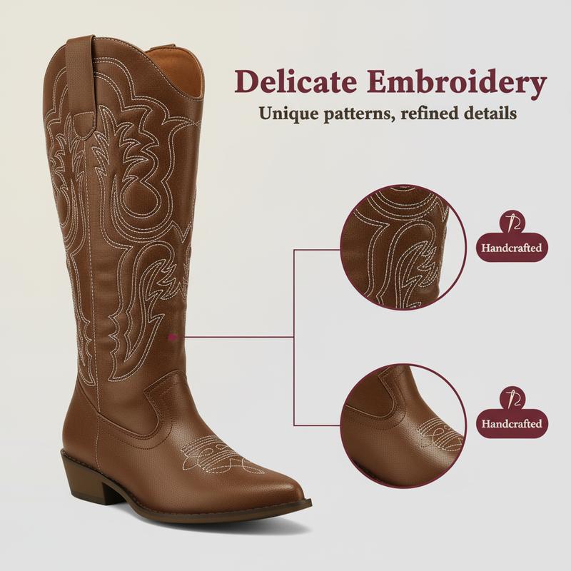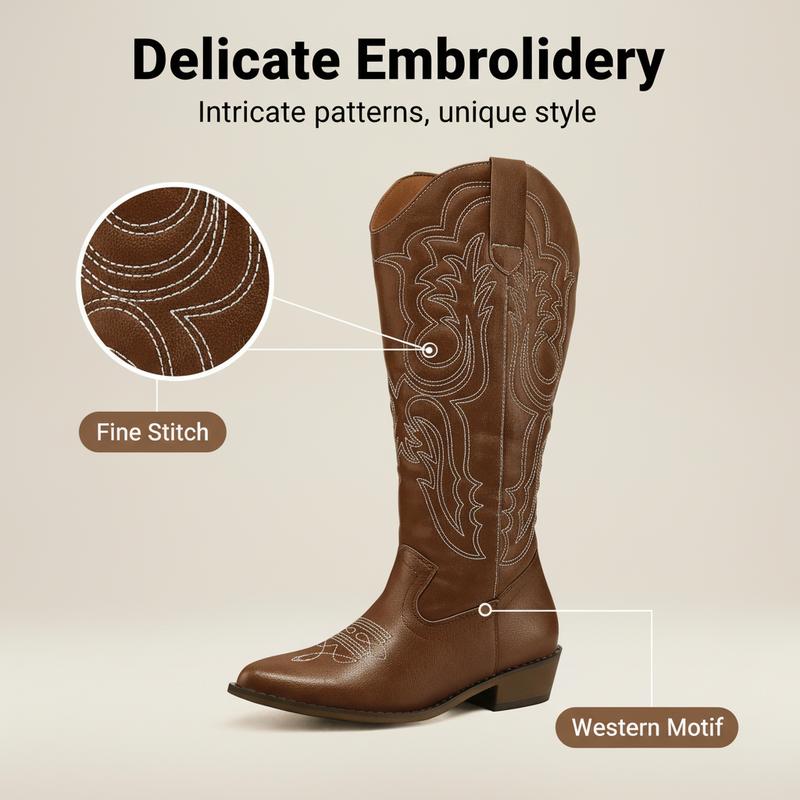 【Classic western embroidered style】Women's cowboy boots shaft with classic western embroidery. The pointed-toe shape is paired with a rubber sole with a low stacked angled block heel. Unique is the Silver Western Cowgirl Mid-Calf Boot which is made of shiny and textured PU for a metallic look.