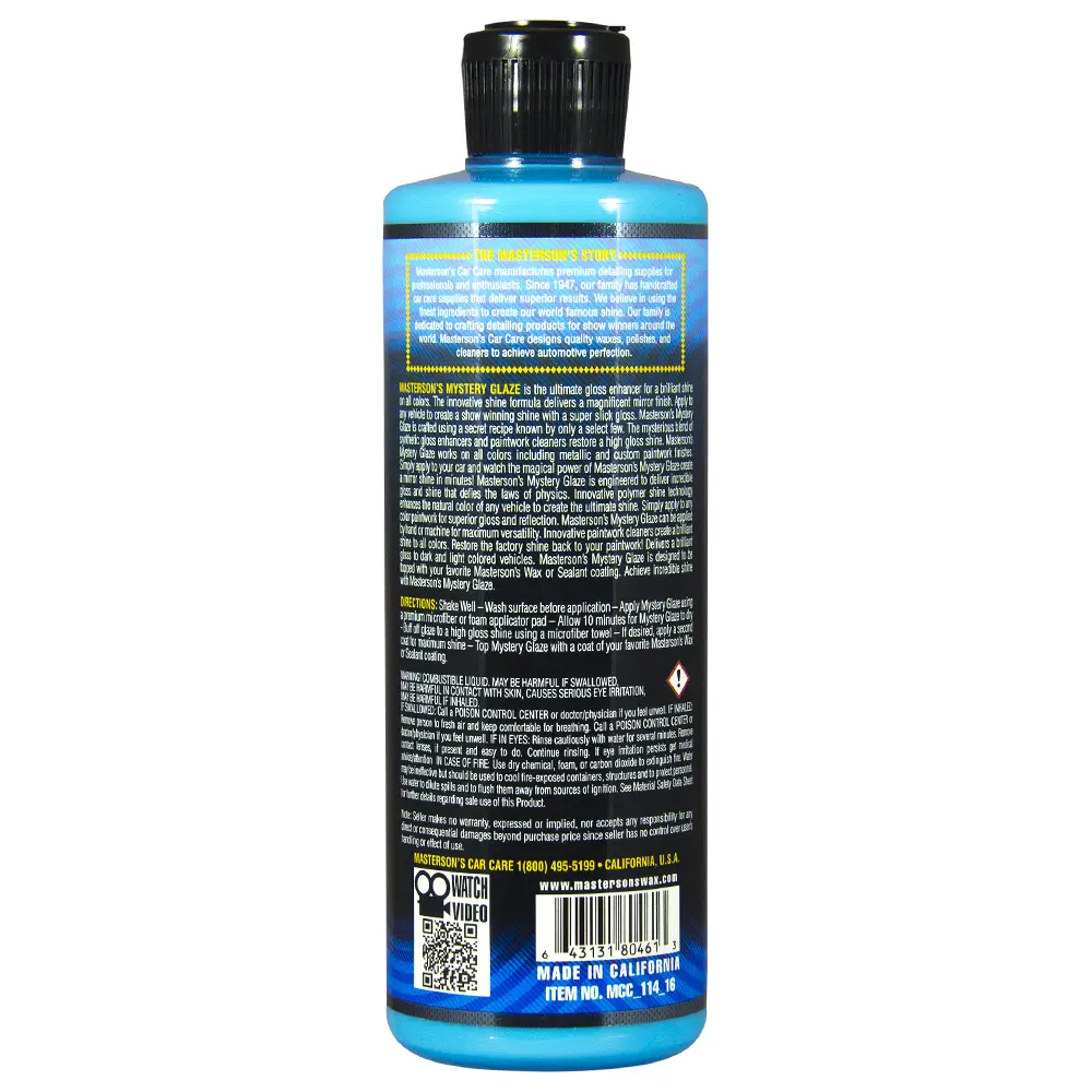 Masterson’s Mystery Glaze is the ultimate gloss enhancer for a brilliant shine on all colors. The innovative shine formula delivers a magnificent mirror finish. Apply to any vehicle to create a show winning shine with a super slick gloss. Masterson’s Mystery Glaze is crafted using a secret recipe known by only a select few. The mysterious blend of synthetic gloss enhancers and paintwork cleaners restore a high gloss shine. Masterson’s Mystery Glaze works on all colors including metallic and custom paintwork finishes. Simply apply to your car and watch the magical power of Masterson’s Mystery Glaze create a mirror shine in minutes! Masterson’s Mystery Glaze is engineered to deliver incredible gloss and shine that defies the laws of physics. Innovative polymer shine technology enhances the natural color of any vehicle to create the ultimate shine. Simply apply to any color paintwork for superior gloss and reflection. Masterson’s Mystery Glaze can be applied by hand or machine for maximum versatility. Innovative paintwork cleaners create a brilliant shine to all colors. Restore the factory shine back to your paintwork! Delivers a brilliant gloss to dark and light colored vehicles. Masterson’s Mystery Glaze is designed to be topped with your favorite Masterson’s Wax or Sealant coating. Achieve incredible shine with Masterson’s Mystery Glaze. Directions: Shake Well – Wash surface before application – Apply Mystery Glaze using a premium microfiber or foam applicator pad – Allow 10 minutes for Mystery Glaze to dry - Buff off glaze to a high gloss shine using a microfiber towel – If desired, apply a second coat for maximum shine – Top Mystery Glaze with a coat of your favorite Masterson’s Wax or Sealant coating.