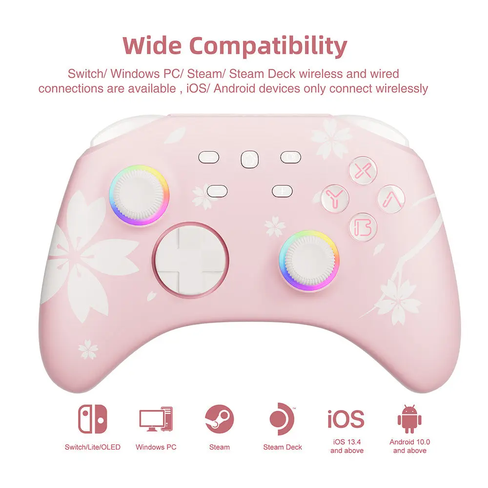This Wireless Pro Controller is compatible with Nintendo Switch, Lite, OLED, Windows PC, Steam, and Steam Deck, offering both wireless and wired connectivity options. It can also connect wirelessly with iOS devices (version 13.4 and above) and Android devices (version 10.0 and above). It is an excellent choice for games such as Genshin Impact, Fortnite, Zelda, Mario Kart, and more.