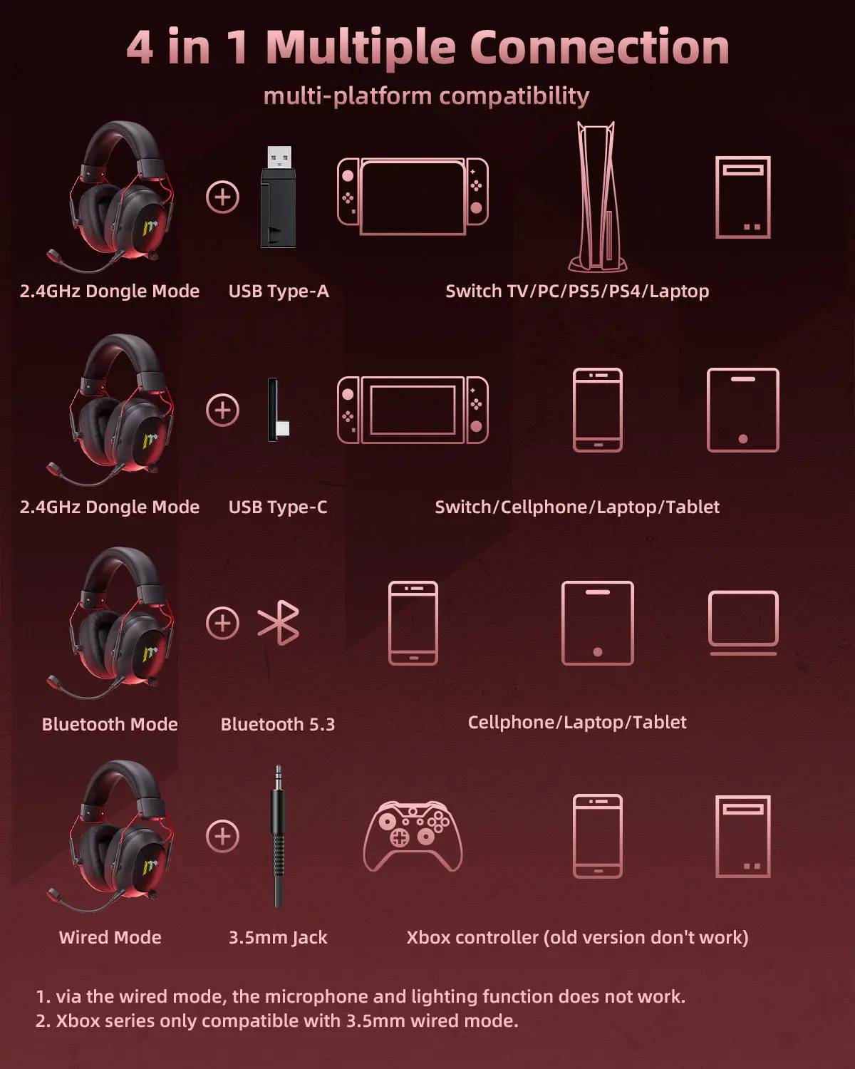 【Unleash Broad Compatibility】The Tac Master Gaming headset, equipped with a 2.4GHz USB dongle & Type C Transmitter, Bluetooth 5.3, and a 3.5mm jack cable, offers effortless connectivity to a diverse array of gaming devices. The 2.4G USB dongle offers plug-and-play convenience for PC, PS4/PS5, and Switch Docked Mode. Simultaneously, the 3.5mm jack delivers superior performance with XBOX, game console controllers, or phone/tablet devices. This gaming headset ensures a smooth transition between ARPG, FPS, and other gaming genres, enhancing your gaming experience.