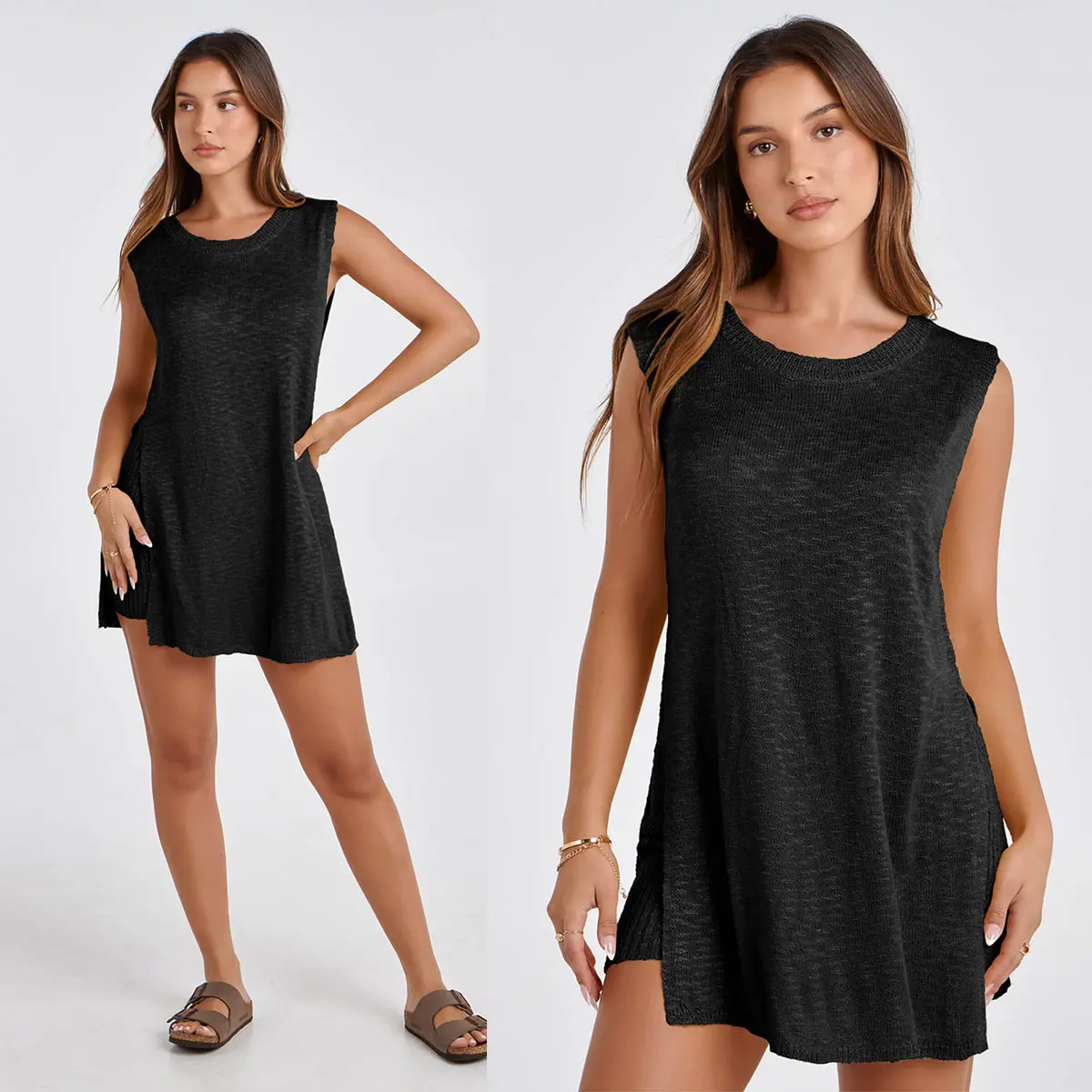 The top boasts a high boat neckline, dropped armholes, and a vented hemline. It features a longline, tunic fit style. The ribbed fabrication ensures a snug fit. This piece is ideal for layering or wearing alone, making it versatile for various occasions.