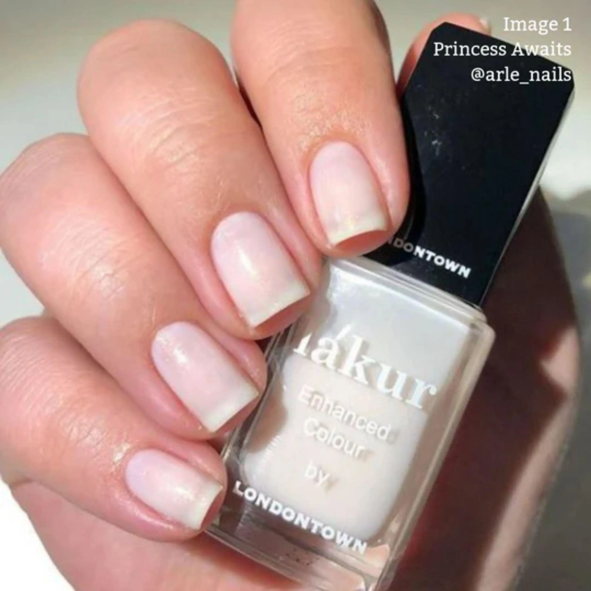 Princess Awaits is a beautiful sheer color of the palest pinkish white with just a touch of bronzy shimmer. It is very slight so no sparkling nonsense here! Just pure elegance! I have 2 coats on in the photo (These are my natural nails-no French manicure or gels or dips...)