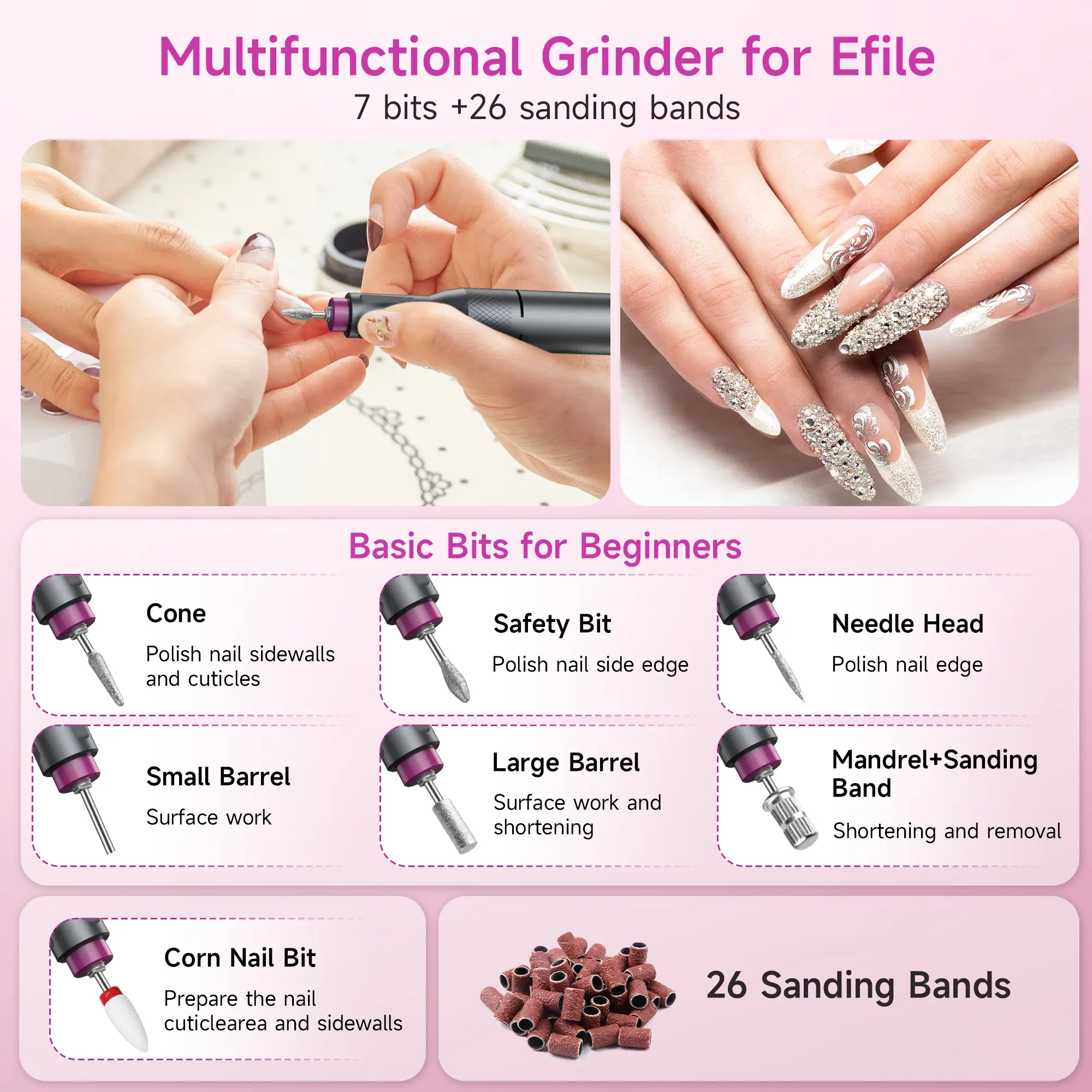 Comes with six professional-grade metal/carbide nail bits, catering to various nail care needs such as trimming, grinding, carving, and polishing, as well as removing cuticles and calluses. The drill also features a pause function, allowing you to start or stop with a simple press of the button.