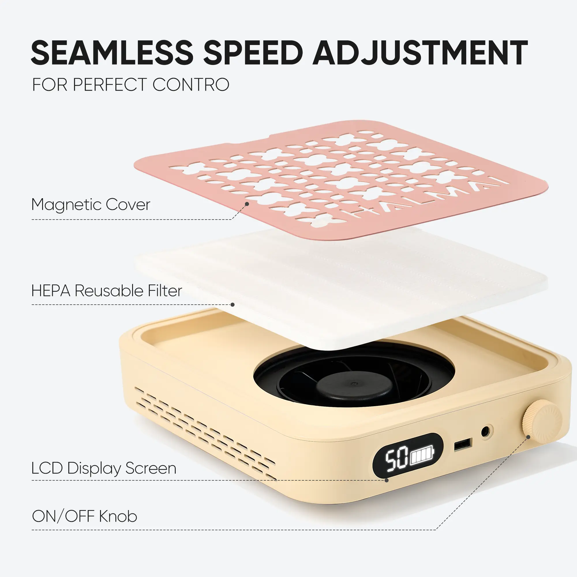 Featuring a high-efficiency reusable filter, the HALMAI nail dust collector effectively traps fine nail dust and debris during manicure sessions. The filter supports repeated use, helping reduce maintenance costs while keeping your workspace clean. Dual cooling vents and a heat-resistant alloy core prevent overheating during extended use.