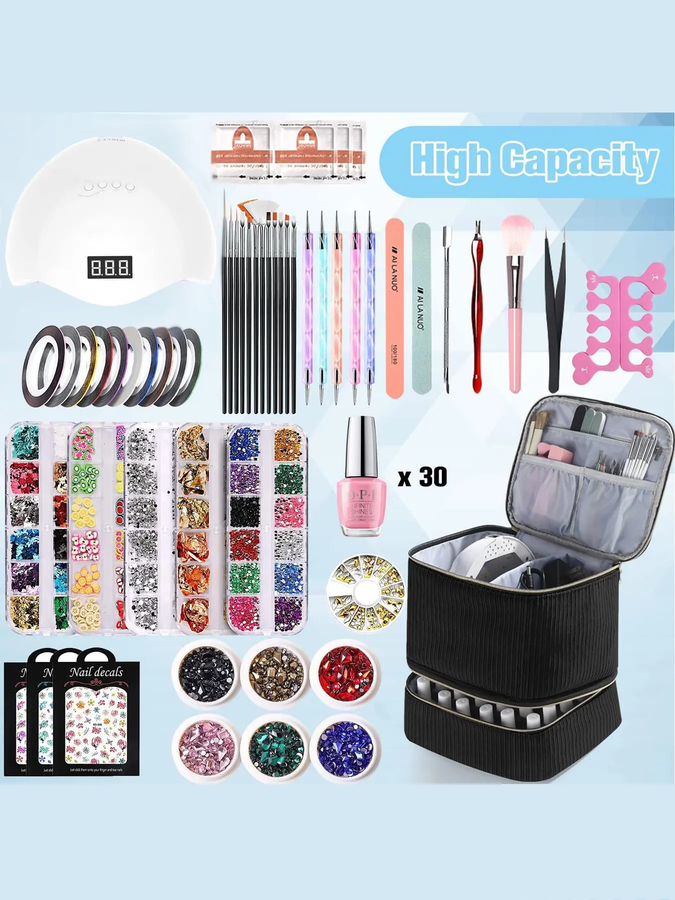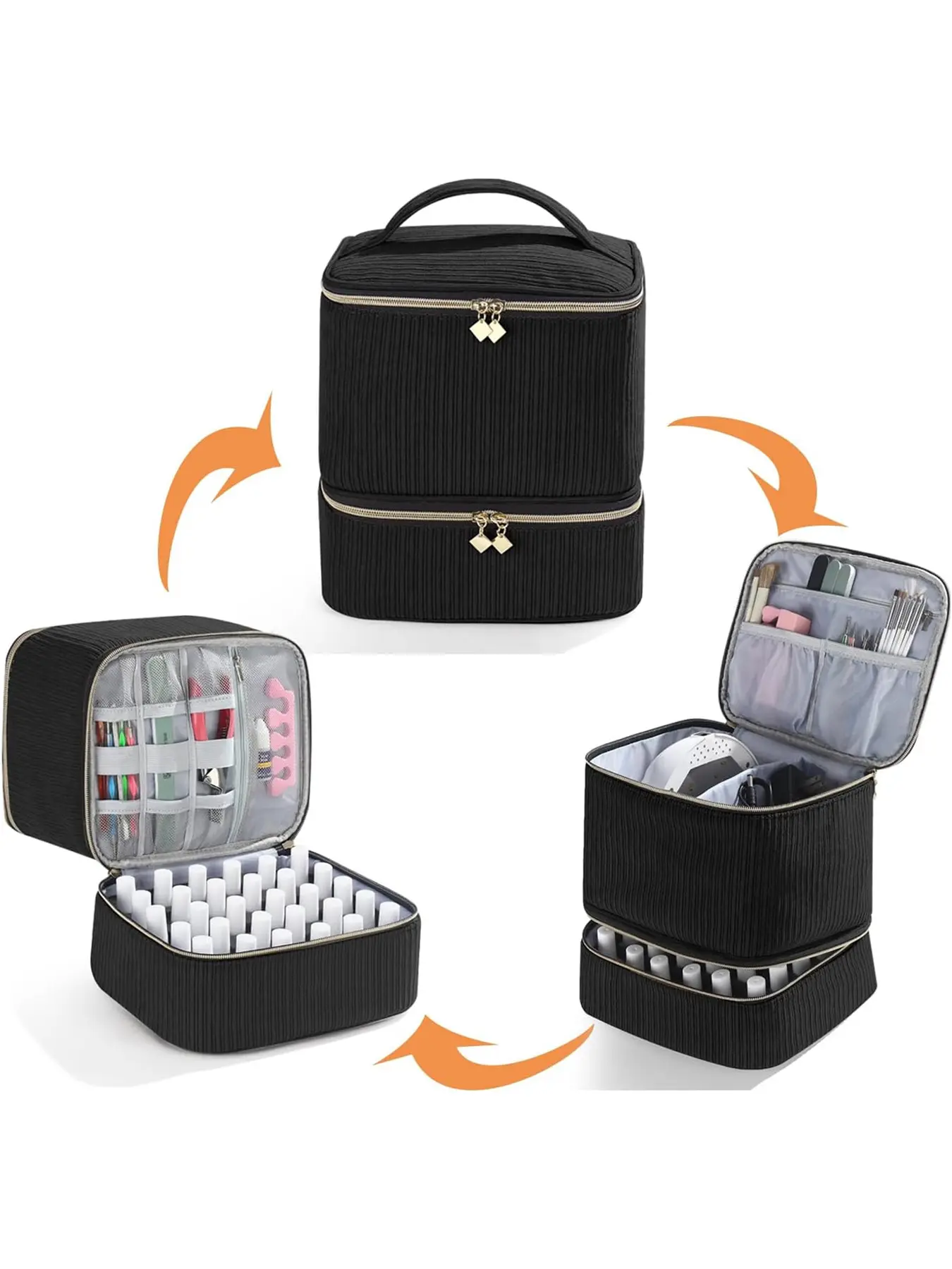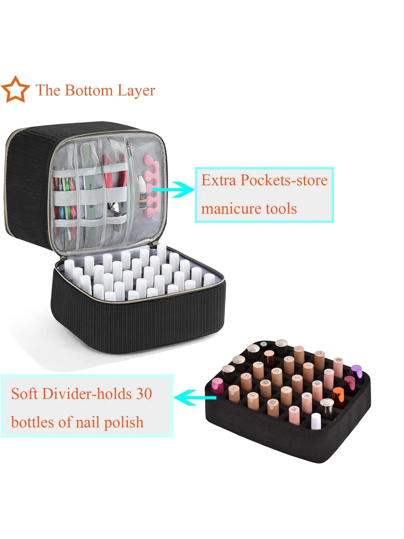 The Bottom Layer: The bottom compartment with a removable foam insert can hold 30 bottles of 15ml (0.5 fl.oz) nail polish. Importantly, the soft foam insert can suitable for more bottles of varying size and ensures every bottle of nail polish put separately, avoiding bumping