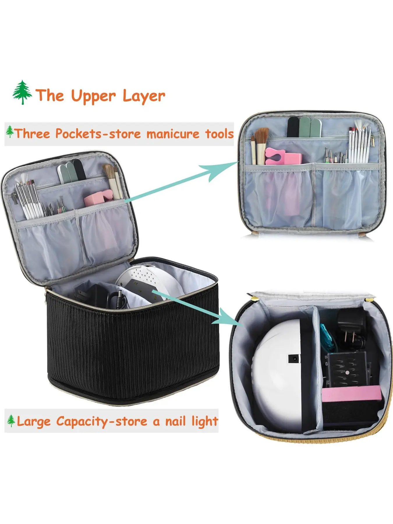 The Upper Layer: The upper layer has a big compartment and a removable divider, which can hold the nail lamp and the power cord. And there are three pockets for your files, nail drill, nail polish remover, cotton pads and etc