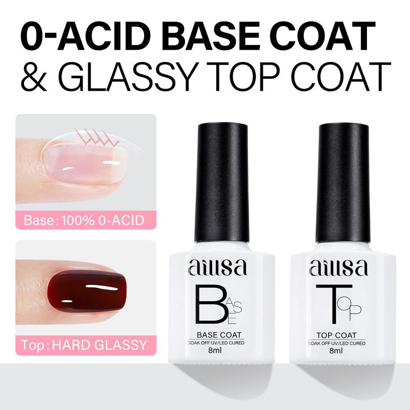 ·【 GOOD ADHESION of BASE COAT & GLASSY TOP COAT 】AILLSA's new gel base coat provides protection for your nails while having excellent adhesion and leveling, making the color gel last longer.AILLSA no wipe gel top coat not only gives your color gel a beautiful glow, but also has excellent resistance to abrasion and smudging.So you can do any work after curing without worrying about scratching or cracking your nails.