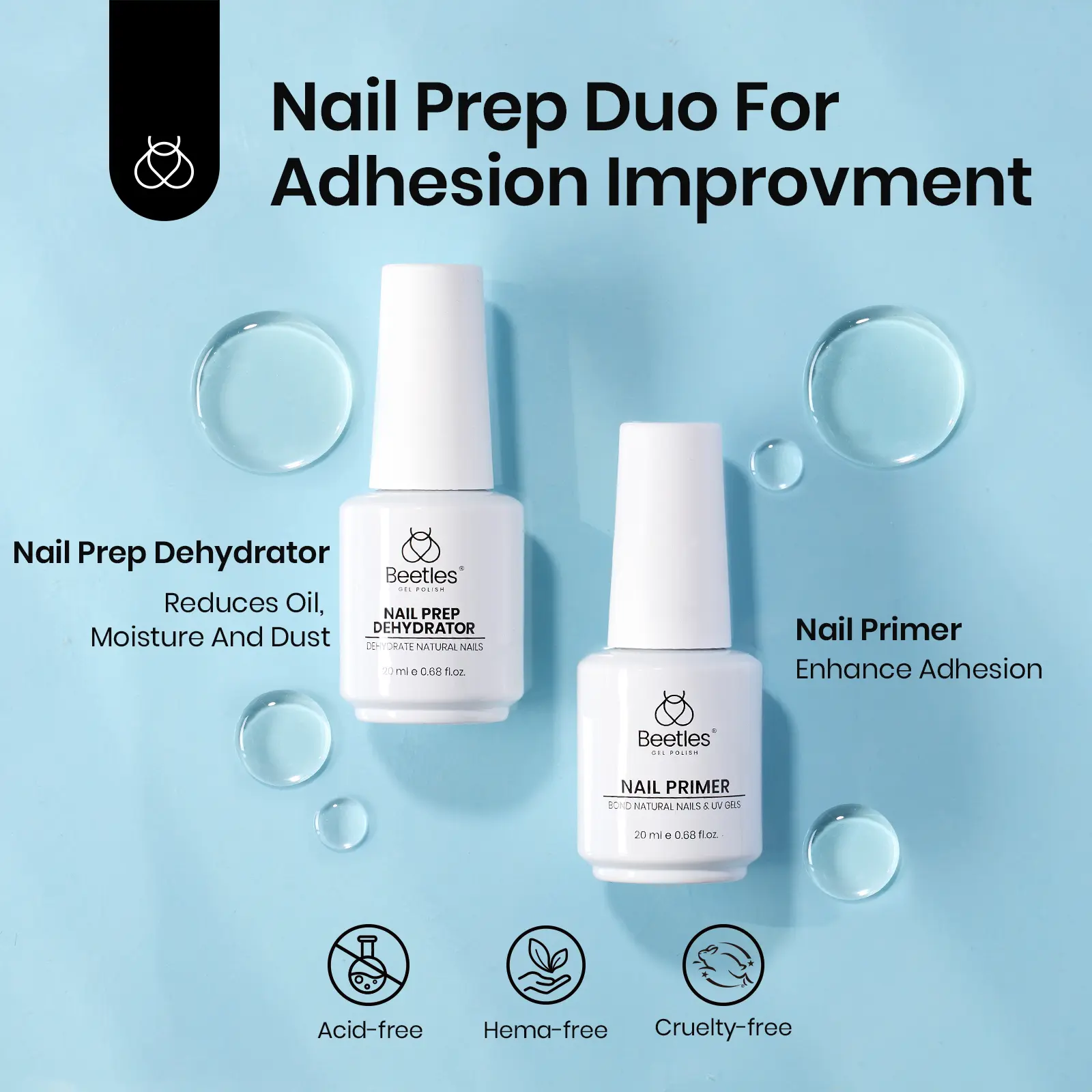·Hema Free Formula: Beetles nail dehydrator and primer set use an Hema Free formula, reduce the risk of adverse reactions. which is naturally gentle and will not harm natural nails, while providing excellent cleaning effects.