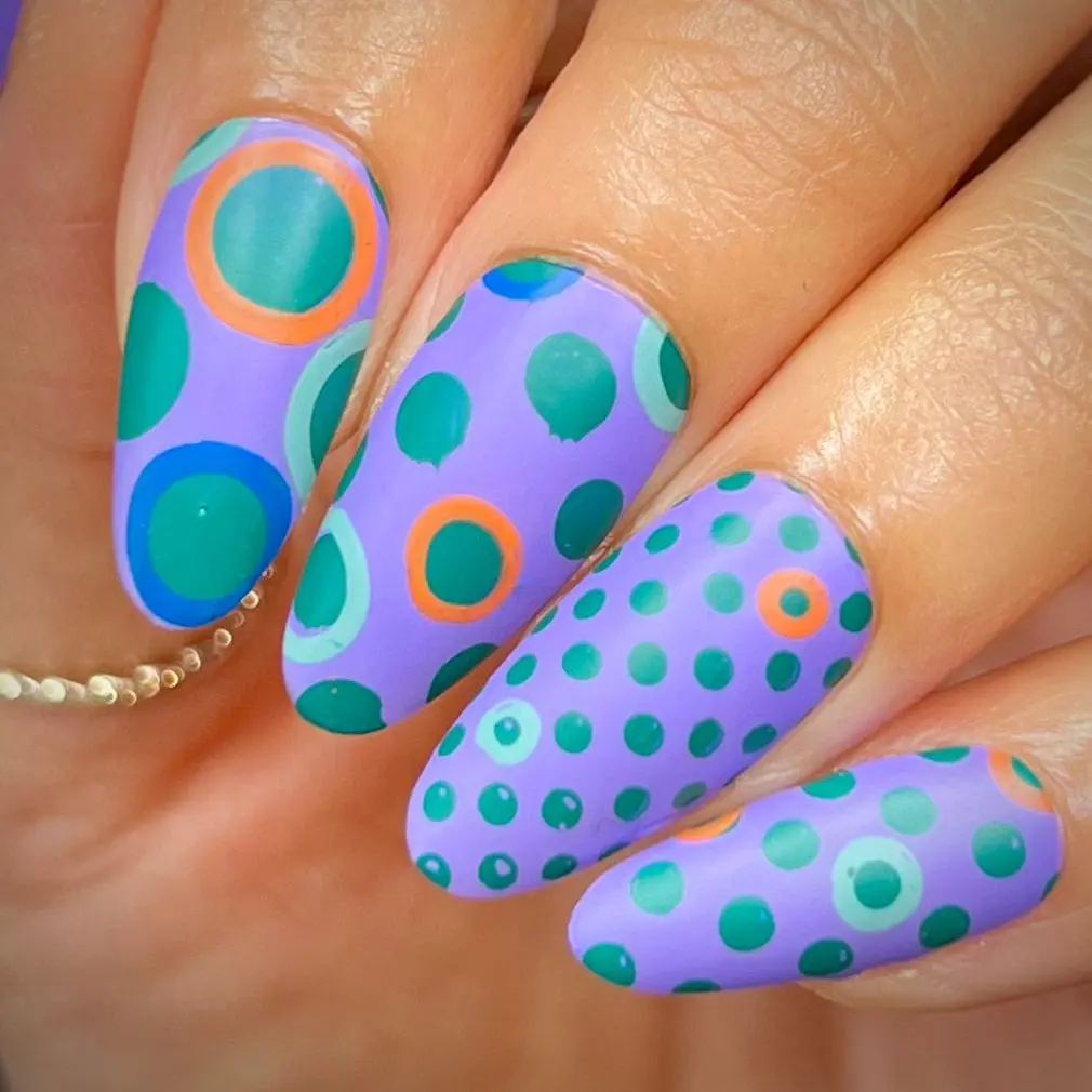 Respectfully, Pantone..... we'll keep it colorful over here🌈💅 ▶️ Seeing Spots (M475) #polkadot #polkadotnailsart #luckynails #fengshui #newyearnails #pantone #clouddancer
