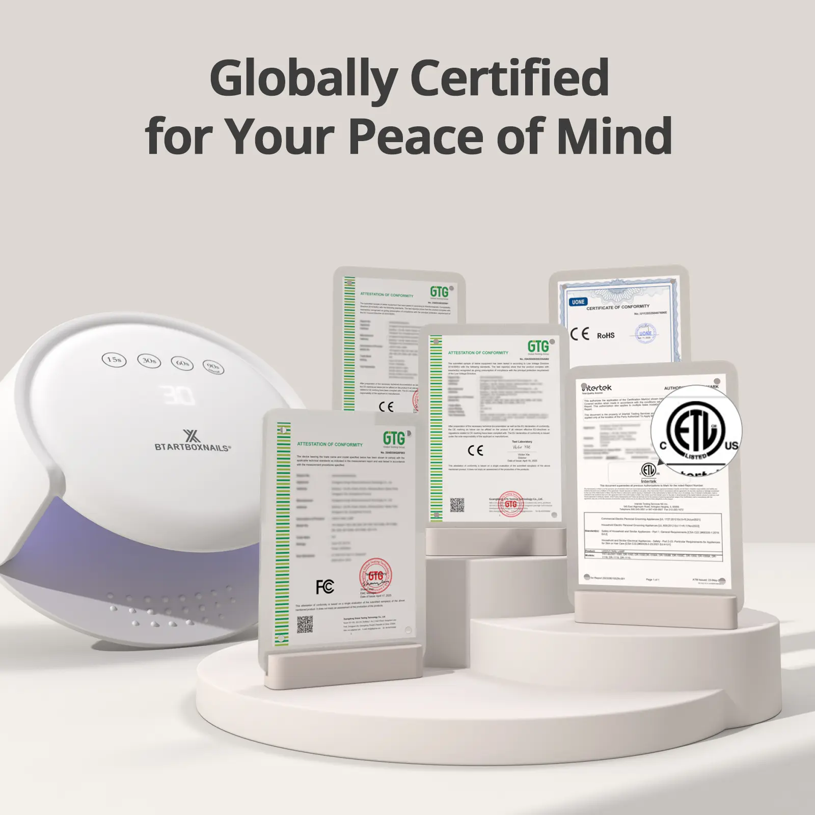 ·ETL/FCC APPROVED (USA Standards) + CE/EMC/RoHS COMPLIANCE: BTArtboxnails XCuringPRO Nail Lamp is backed by 5 certifications which ensure electrical safety & prevent overheating risks found in uncertified lamps.