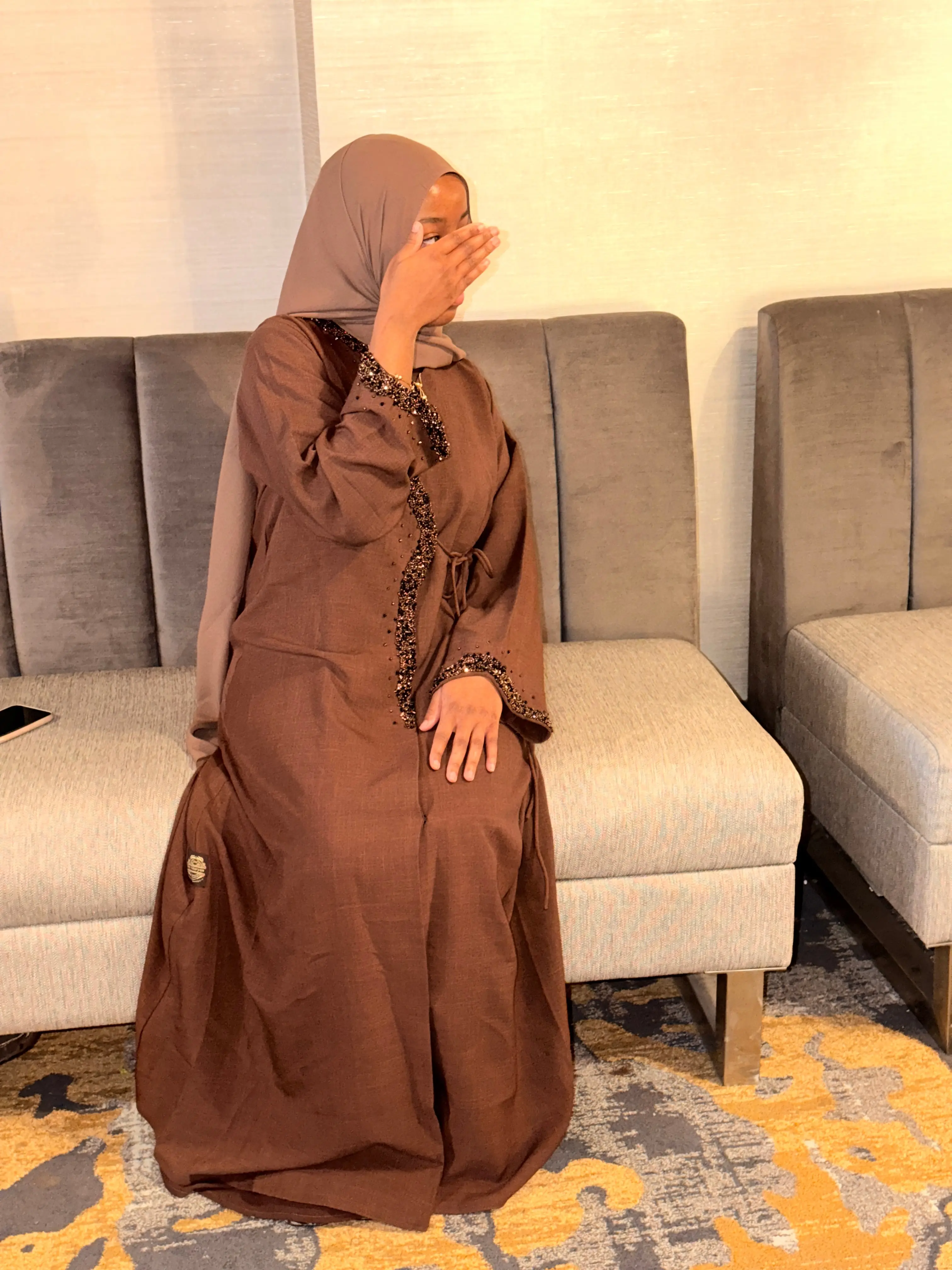 Premium Maxi Abaya – Special Occasion Elegant maxi-length abaya crafted from smooth, flowing Korean Koba fabric. Designed in a loose, modest fit with a soft drape for all-day comfort. Features refined hand-embellished bead detailing along the front and sleeve cuffs, finished with a subtle side tie waist for adjustable shaping. Ideal for special occasions such as Eid, formal gatherings, and evening events.