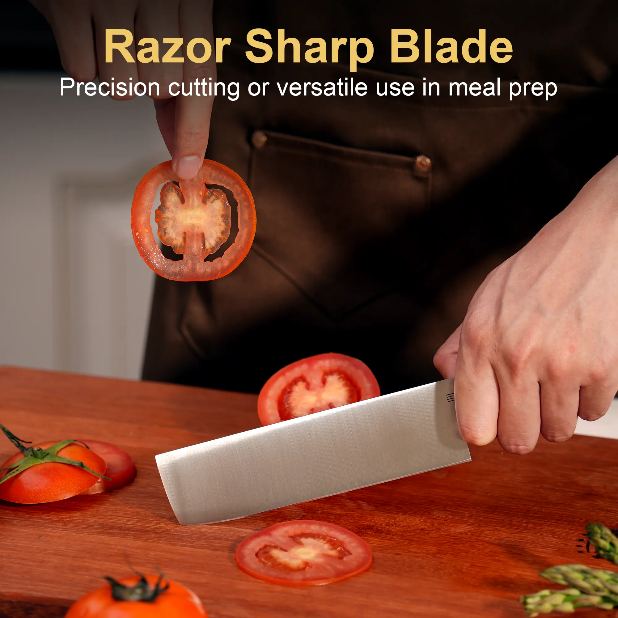 ·【Professional Asian Knife】- Designed for gourmet cooking, this 6" nakiri knife is flexible and durable, and can cut a variety of foods from fruits and vegetables to meat and fish. Equipped with an oak sheath, you only need one knife to easily complete the preparation of various ingredients.