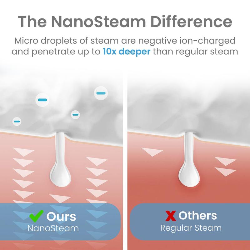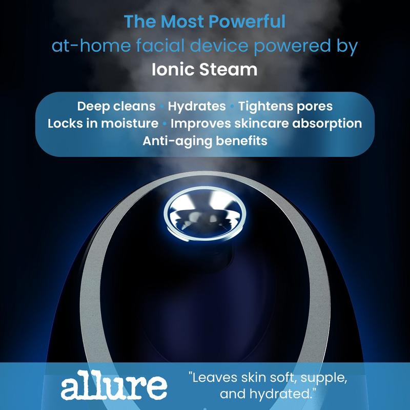 Advanced Nano-Ionic Facial Steamer with Smart Steam Technology - Experience the most luxurious and cutting-edge facial steam in the comfort of your home. NanoSteamer Luxe combines a heating element with an ultrasonic vaporizer, for ultra-fine negative ion-charged water droplets that are up to 10x more effective at penetrating skin compared to regular steam. It also has an aromatherapy basket, 6 steam modes, and an auto-shut off sensor.