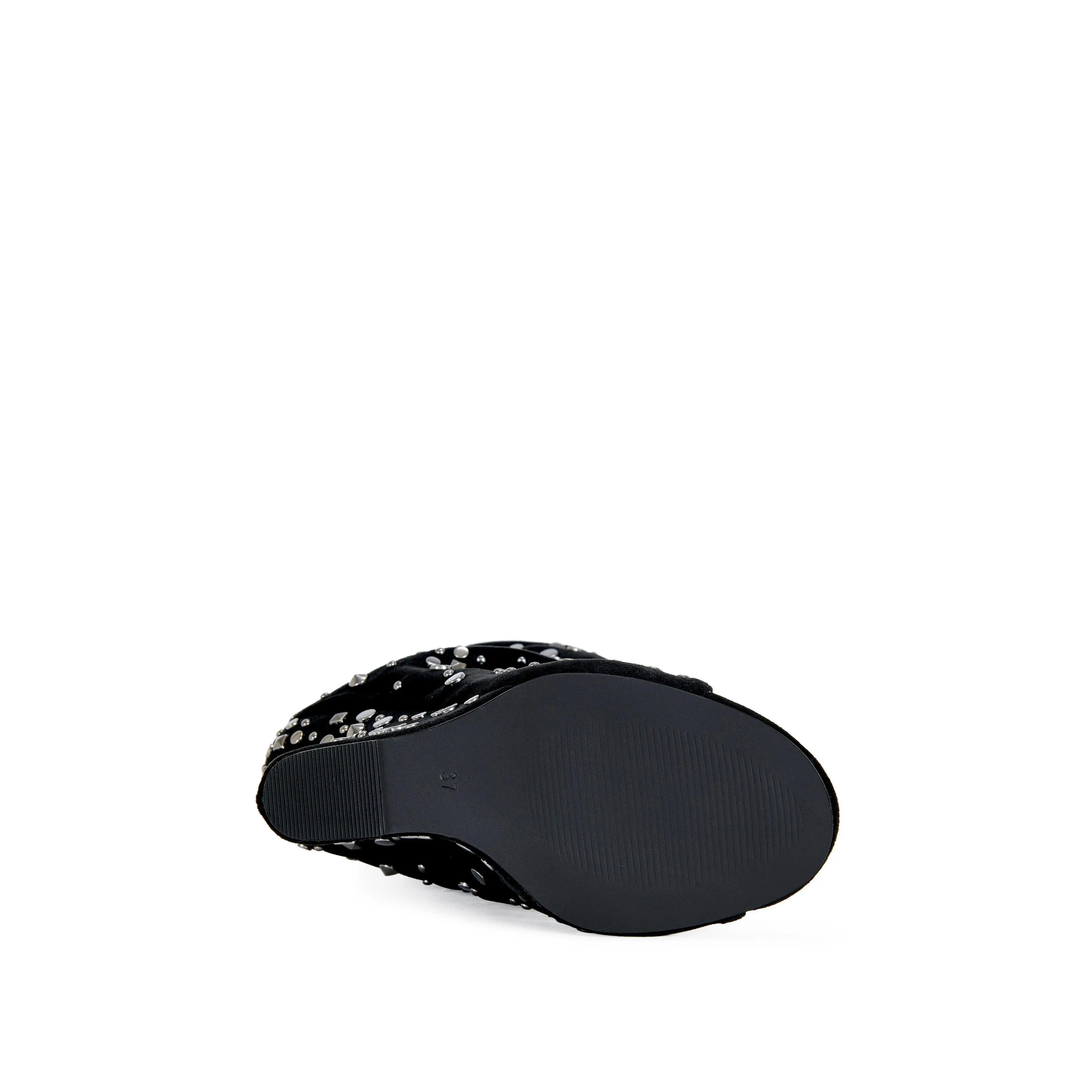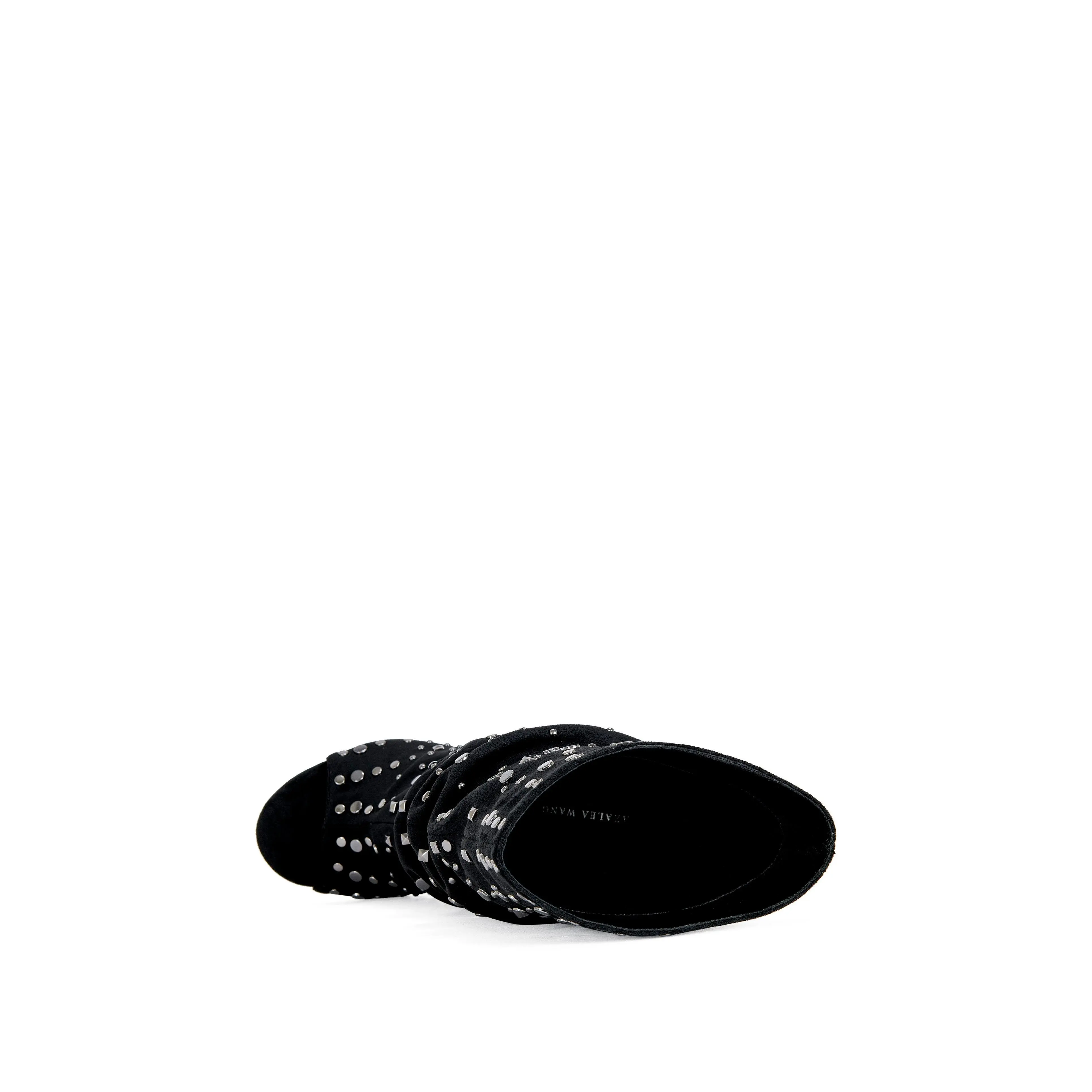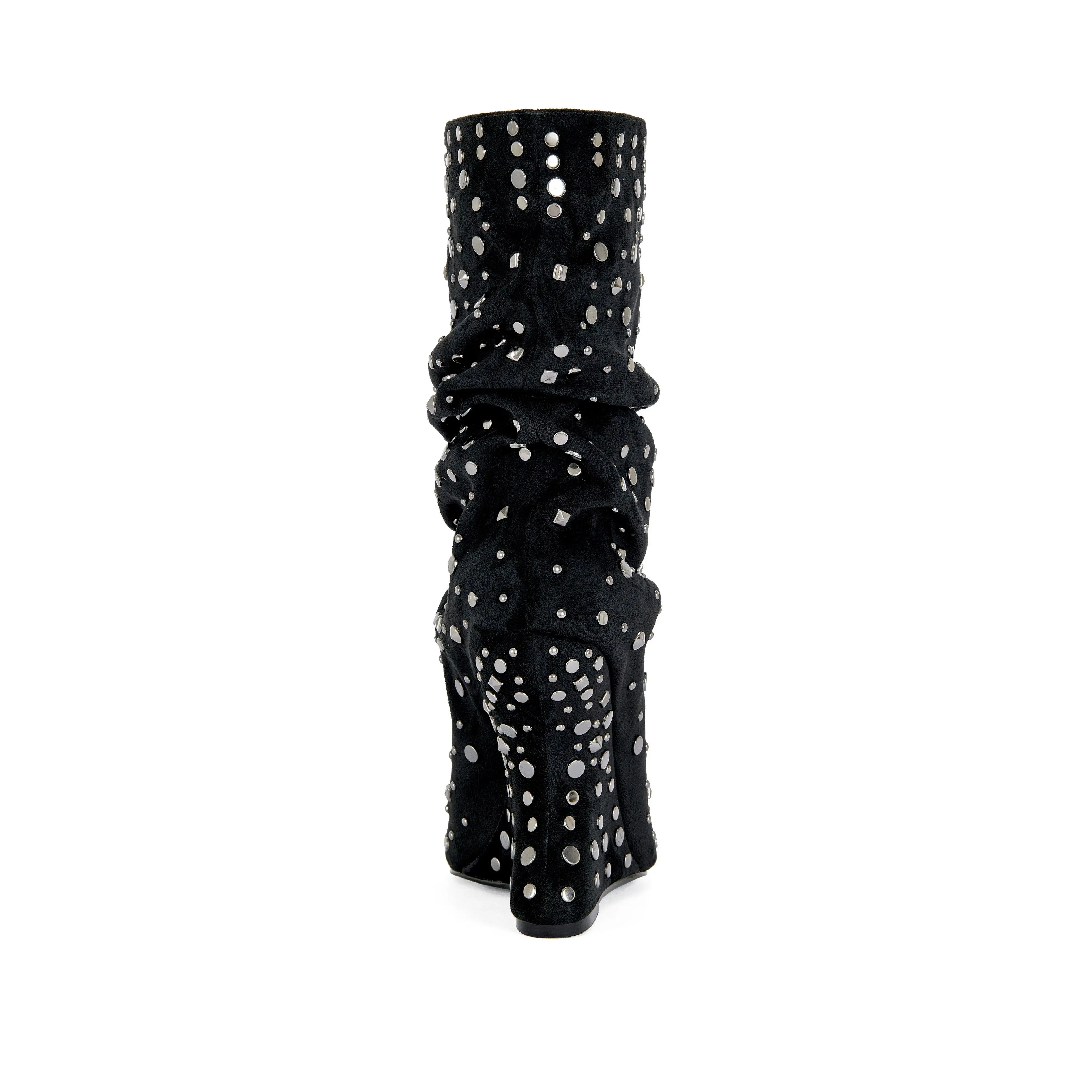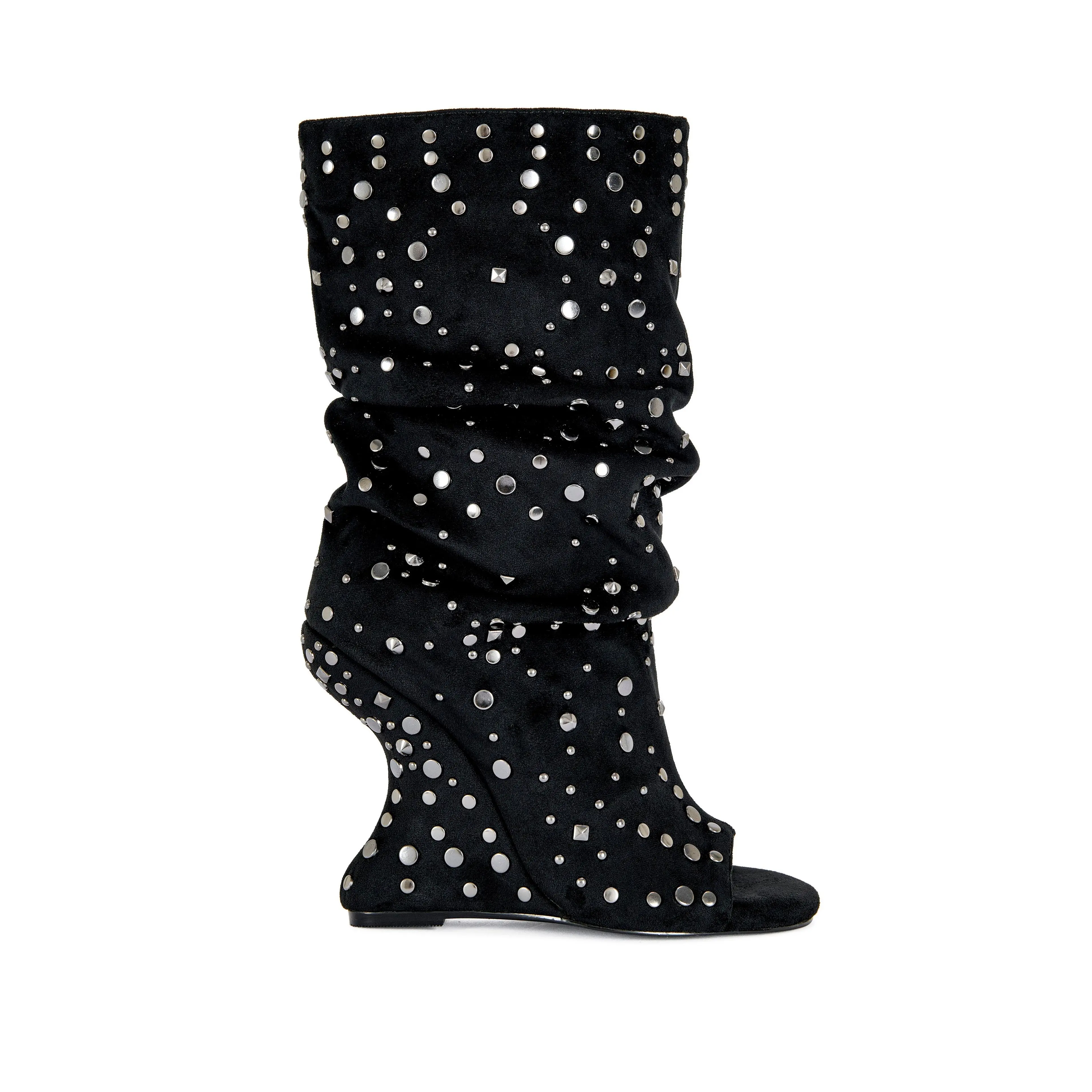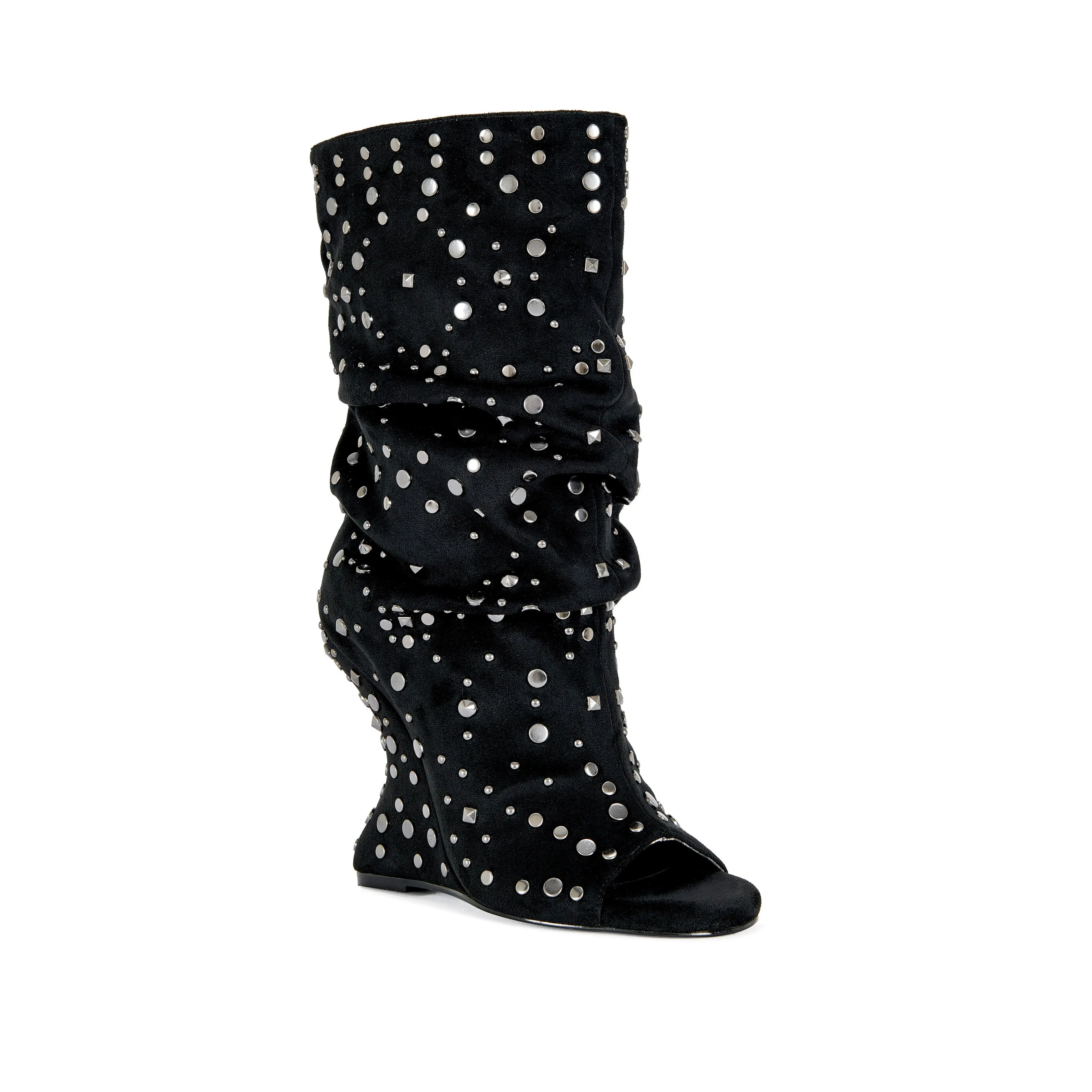 Sweet with an edge.Slouchy faux suede wedge bootie with stud detailing, a peep toe, and a sculptural curved wedge—bold, fashion-forward, and made to stand out. Heel height: 4.5" Shaft height: 8" Calf circumference: 17"