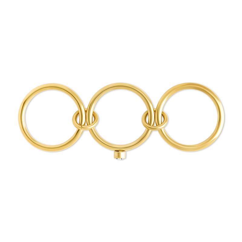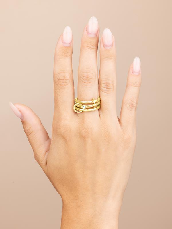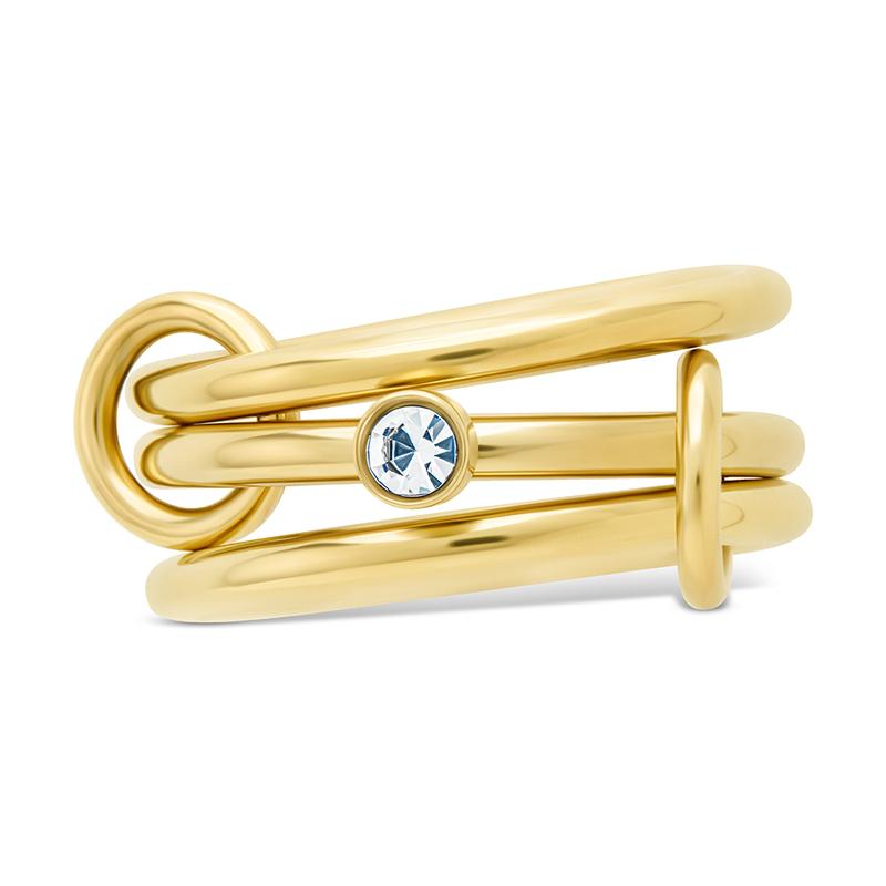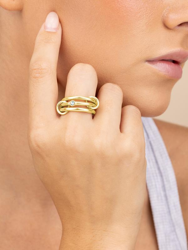 Clean lines, sharp edge. This ring reimagines structure with three high-polish bands joined by a bezel-set CZ—bold yet refined, and made for stacking or solo impact.