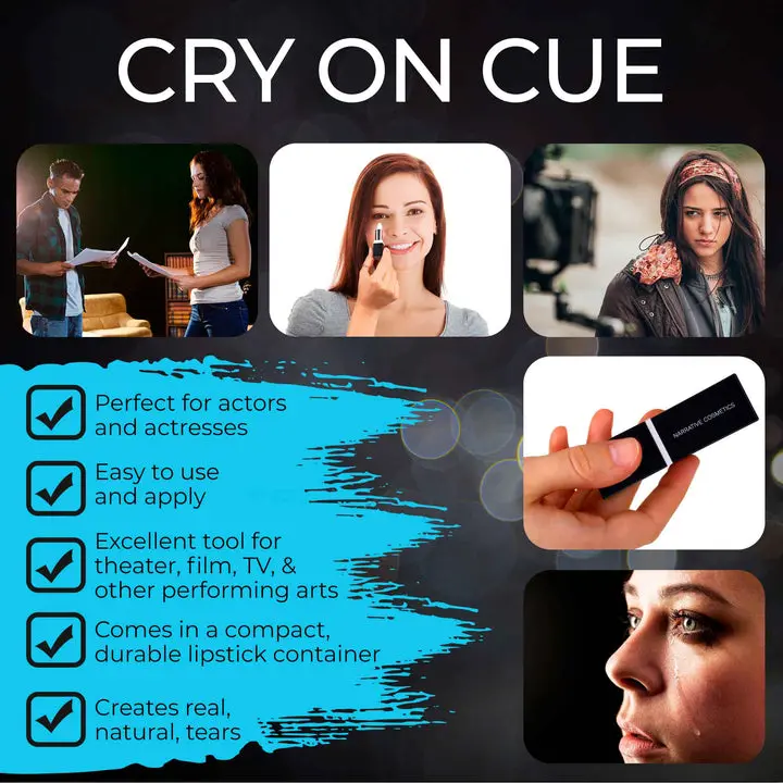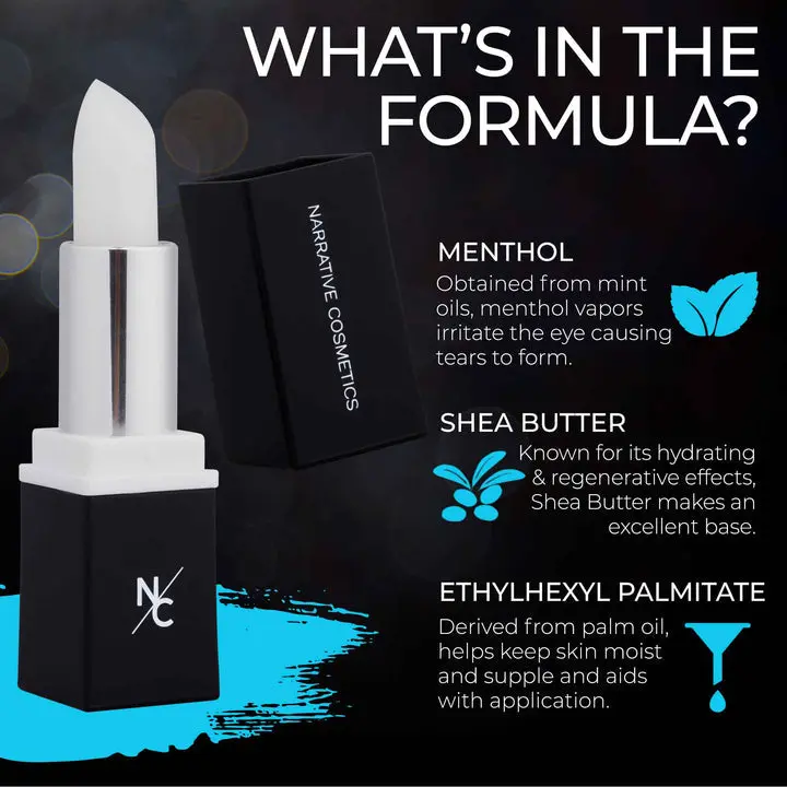 Narrative Cosmetics Tear Stick is a menthol-infused wax that gives you natural tears to cry on cue. It's an excellent tool for theatre, film, TV, and other performance arts. Compact and portable, Tear Stick comes in a small durable lipstick container. It's easy to use and is activated by the warmth of your skin.