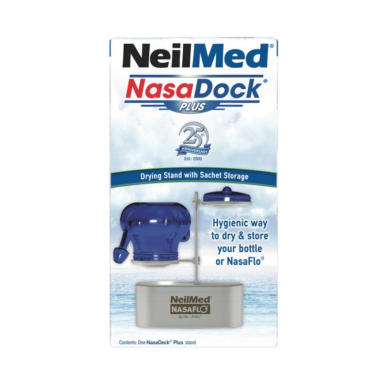 The NasaDock Plus drying stand offers the ideal drying and storage solution for your Sinus Rinse squeeze bottle system or NeilMed Neti Pot. Use the drying device to reduce the chance of contamination. The convenient holder can store a month's supply of premixed Sinus Rinse packets.